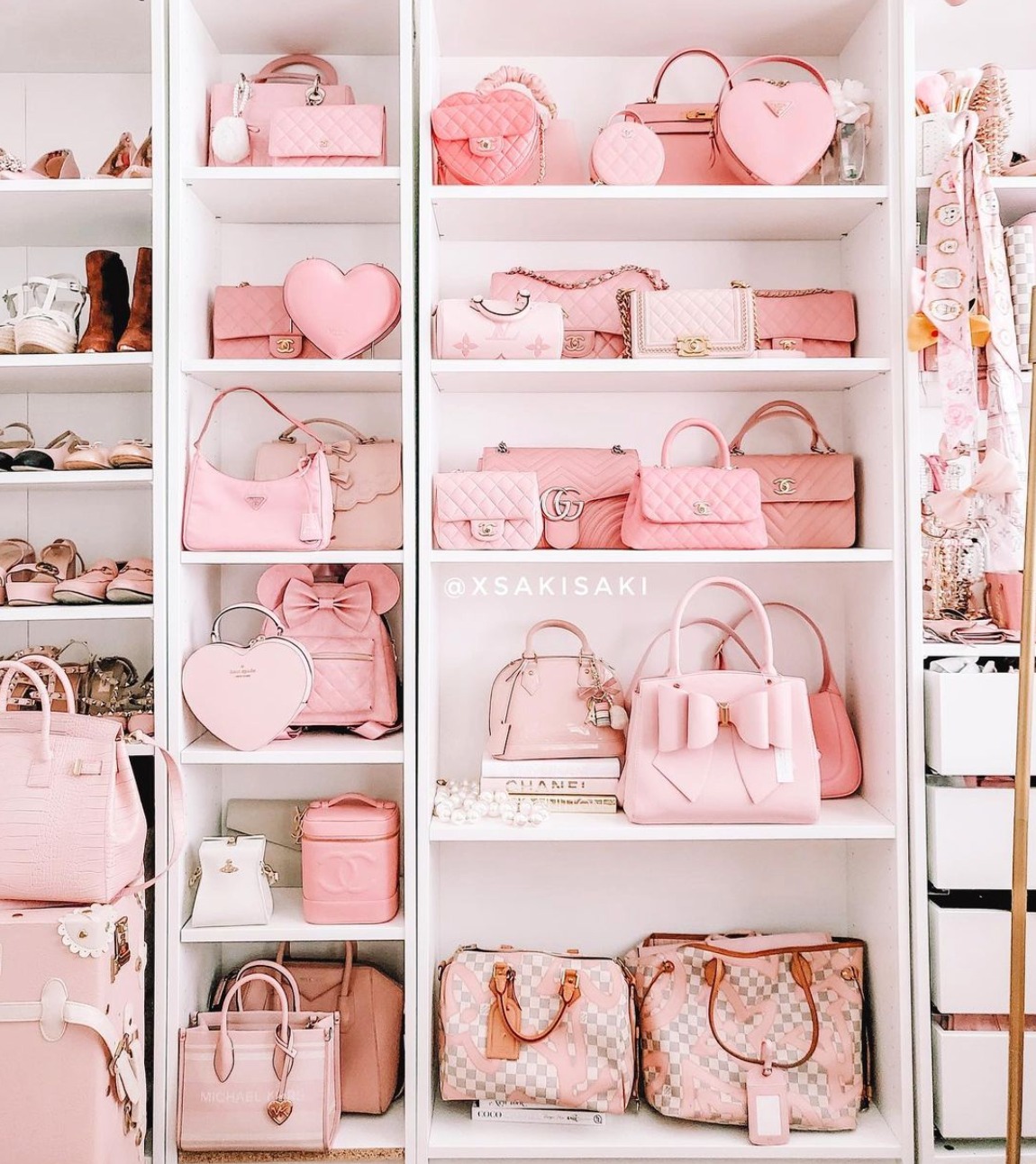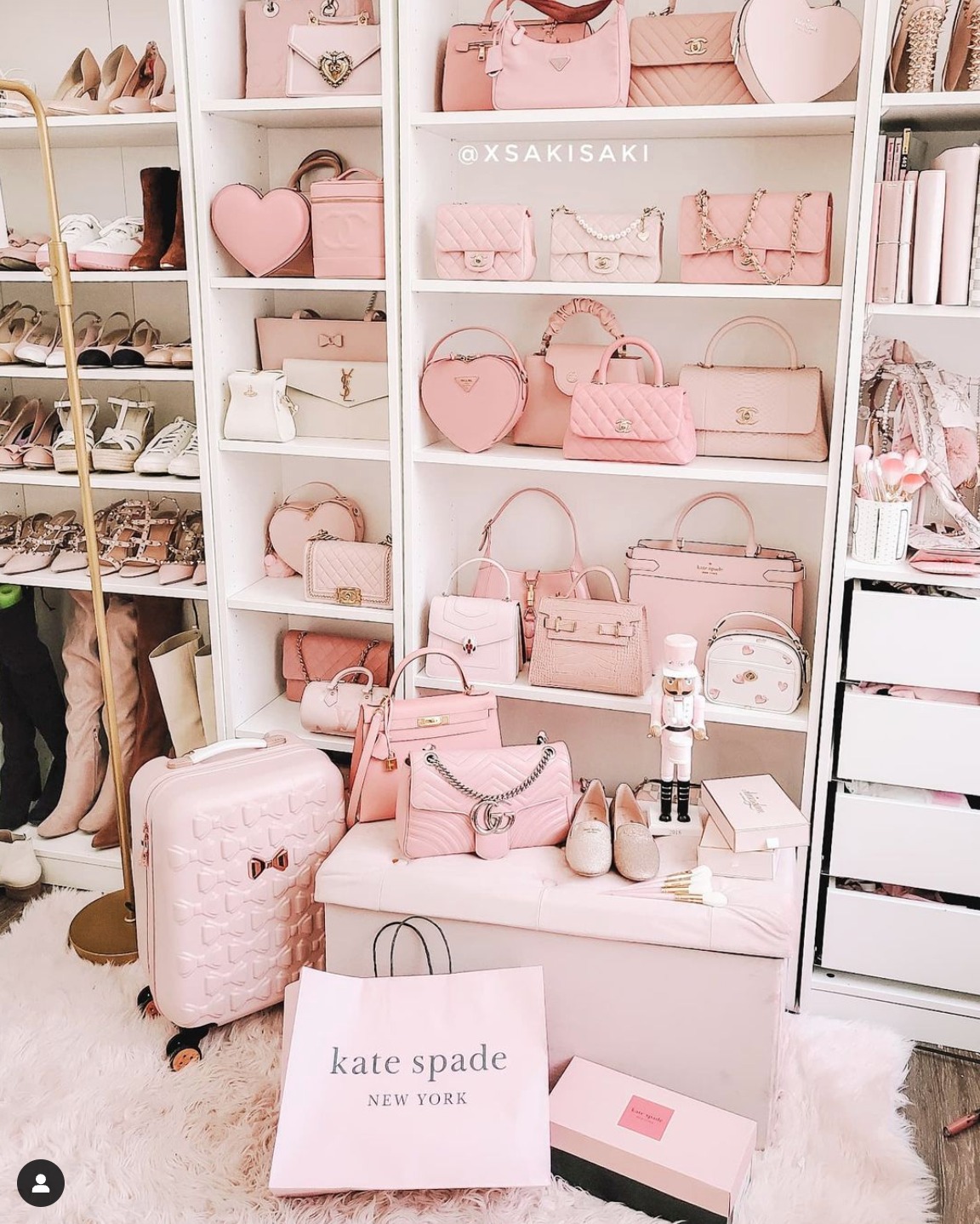 從Saki的IG可見她是位貨真價實的手袋控及粉紅控,寬敞的衣帽間佈滿名牌手袋及鞋子,大衣及頸巾亦是粉紅色,當中的牌子包括Chanel、Hermès、Dior、Prada、Saint Laurent、Louis Vuitton,粉紅色戰利品多得誇張,總值約花過百萬,完全是粉紅控的天堂。