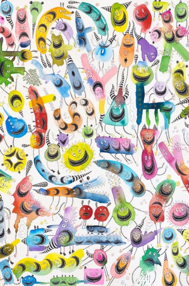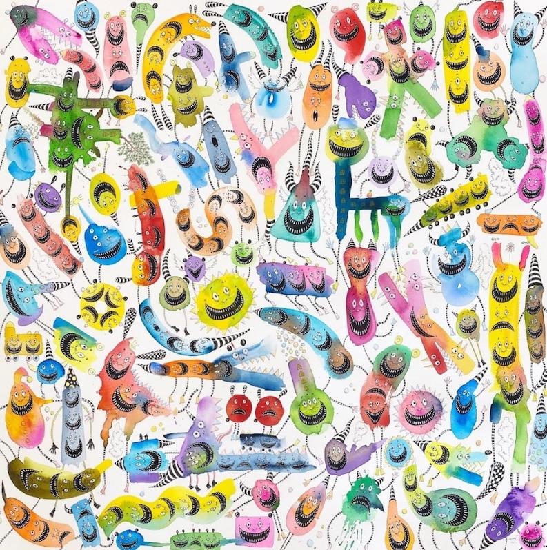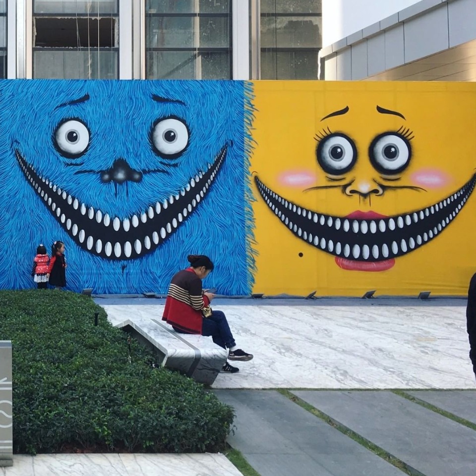 Yoshi47擅長繪畫幽默的怪物角色,靈感來自不二子 A.不二雄的日本熱播電視劇《微笑的推銷員》。他透過色彩繽紛的動畫怪物視覺嘲笑人類,同這些怪物也是我們真實身份的鏡子,深色代表了人類靈魂的鴻溝,鮮豔的明亮色彩則代表了人類的希望,就像藝術品中的陰陽平衡。