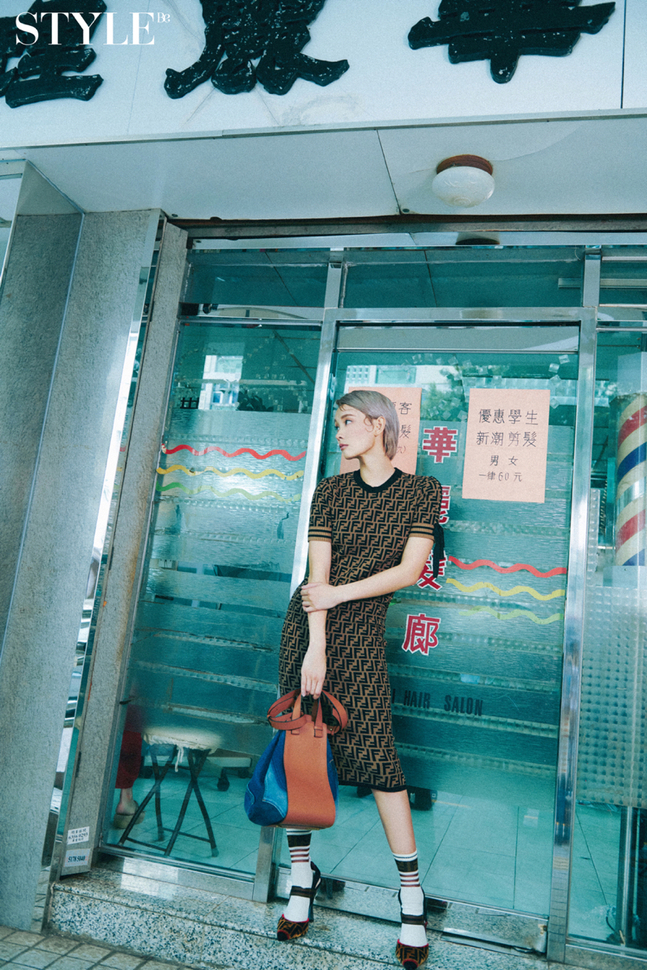 Fendi 經典啡色 FF 針織連身裙、拼色襪、velvet高跟鞋.