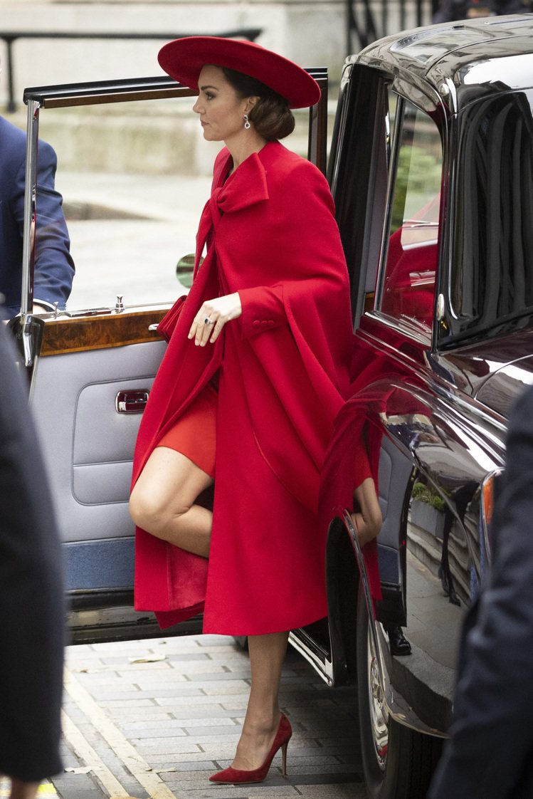 凱特王妃在當天換了兩個造型,先是早上在接見南韓總統尹錫悅與第一夫人金建希時,特意搭配一身紅彤彤的造型-她以 Catherine Walker 的紅色斗篷外套搭配同色系的洋裝、Jane Taylor 的紅帽子和Gianvito Rossi 的紅色高跟鞋,手上也拿著 Miu Miu 的紅色手拿包,一身造型鮮艷奪目雅而不俗氣。