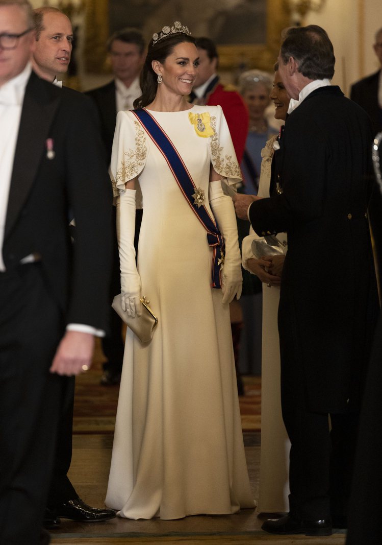 而到了晚上的白金宴會,凱特王妃則穿著了英國設計師品牌 Jenny Packham 為她打造的一襲白色禮服,手上提著另一個英國設計師品牌 Anya Hindmarch 的珍珠白色手提包,她還特意戴上消失了近百年的斯特拉斯莫爾玫瑰王冠(The Strathmore Rose Tiara),讓人十份眼前一亮!一襲優雅感十足的白色禮服和王冠,讓凱特王妃舉手投足也散發出皇室獨有的貴氣。