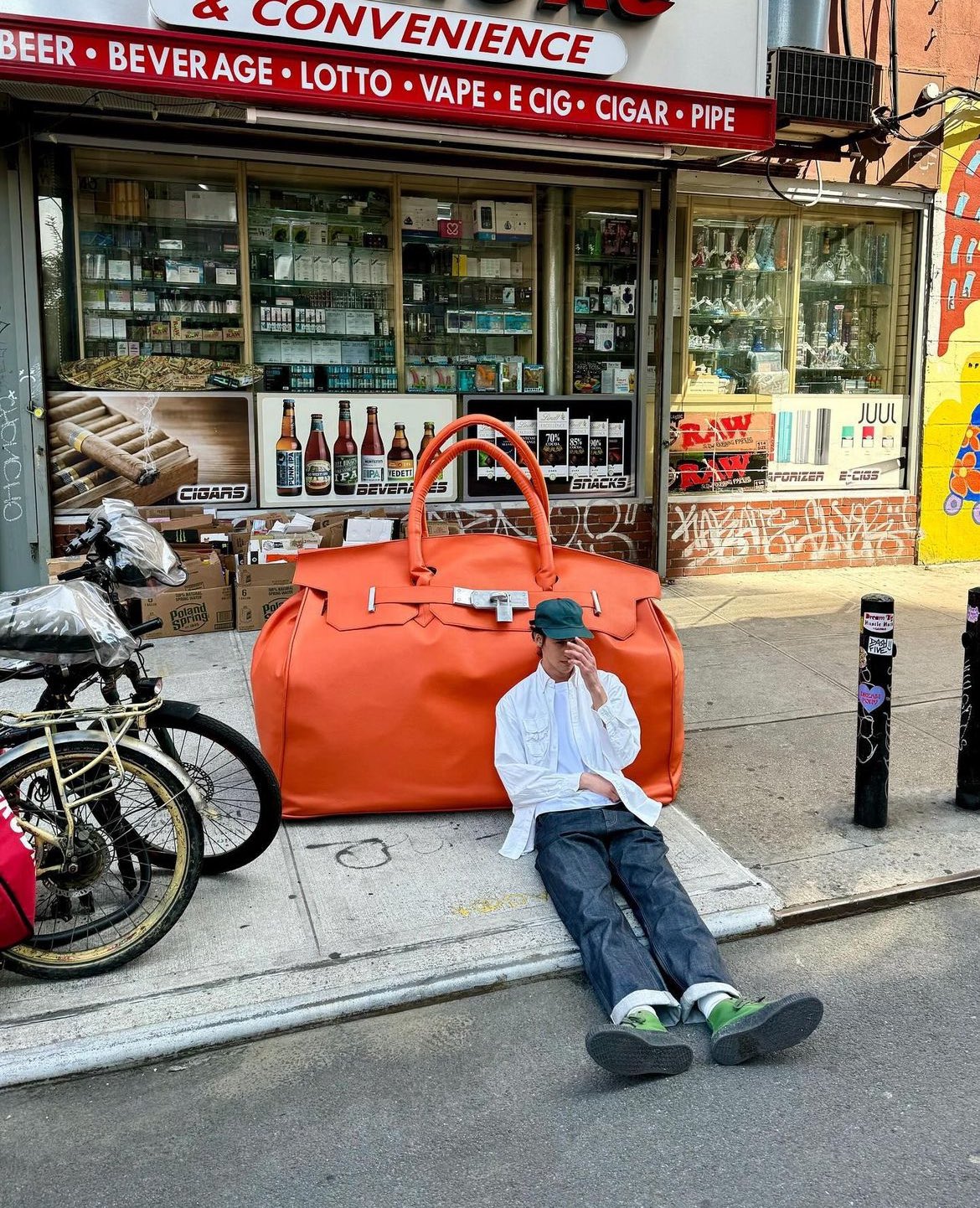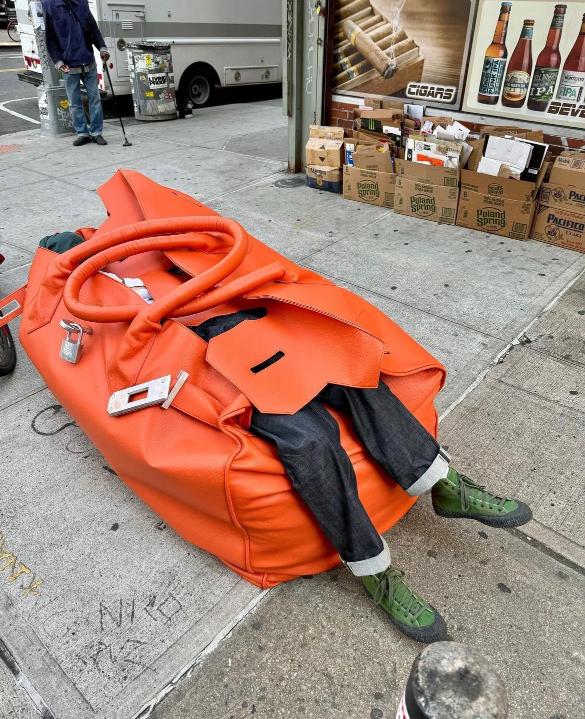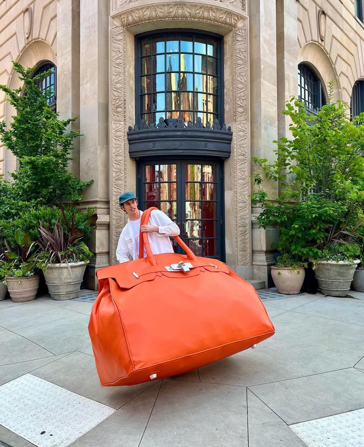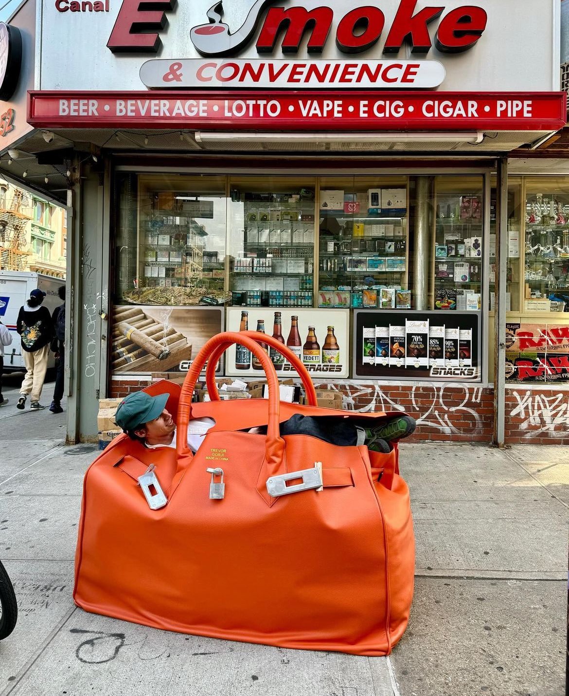 美國設計師品牌 Fugazi 的創辦人 Trevor 最近在其個人 Instagram 上發佈了一輯與一個超巨型的橙色 彷似 Birkin 手袋的合照,此手袋的外形比他整個人還要大,因此他揹著這個手袋在街上遊走時,顯而有點吃力。