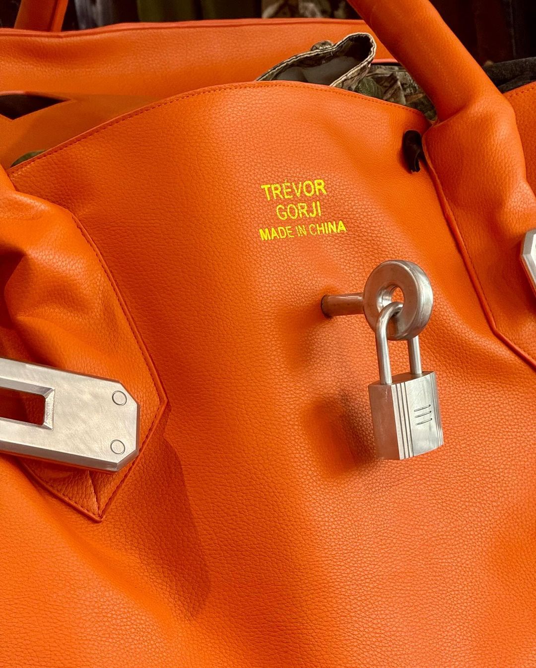 不過若你細心留意,就會發現手袋上的金字並不是寫上 Hermès ,而是寫上了 Trevor 的個人名字「Trevor Gorji」和「Made In China」,帶點惡搞的意味,讓人看過後不禁會心微笑,也避過版權上的問題。