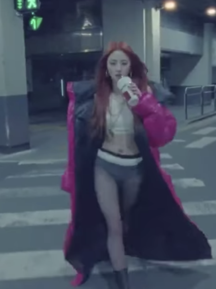 早前 LE SSERAFIM 公佈新曲《Good Bones》的MV 預告片,在 MV 裏成員許允真穿著一套桃紅色羽絨外套,內搭吊帶背心、底褲和黑色絲襪,露出筆直的長腿衣著,這一身搭配內外有著極大反差的「無褲裝」穿搭,性感又帥氣,可是這身衣著造型在韓國當地卻引起了兩極化的反應。
