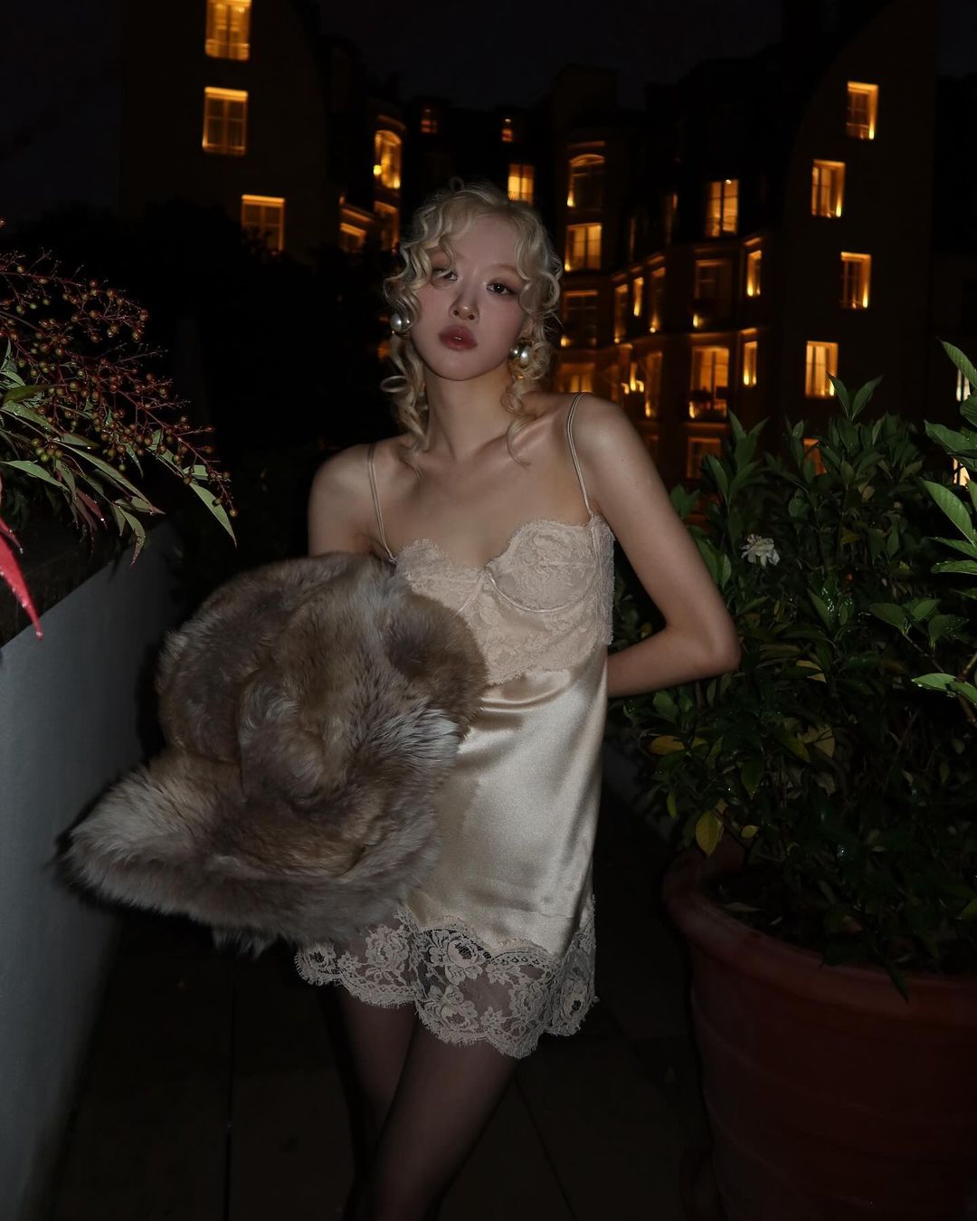 在時裝秀這天,Rosé 穿著了一件像是「性感小睡衣」般的緞面蕾絲連身裙,外搭一件皮草,再配合一頭金色的波浪捲髮,令整體造型流露著濃厚的復古感,渾身亦散發著一份神秘氣質,造型高冷而優雅。