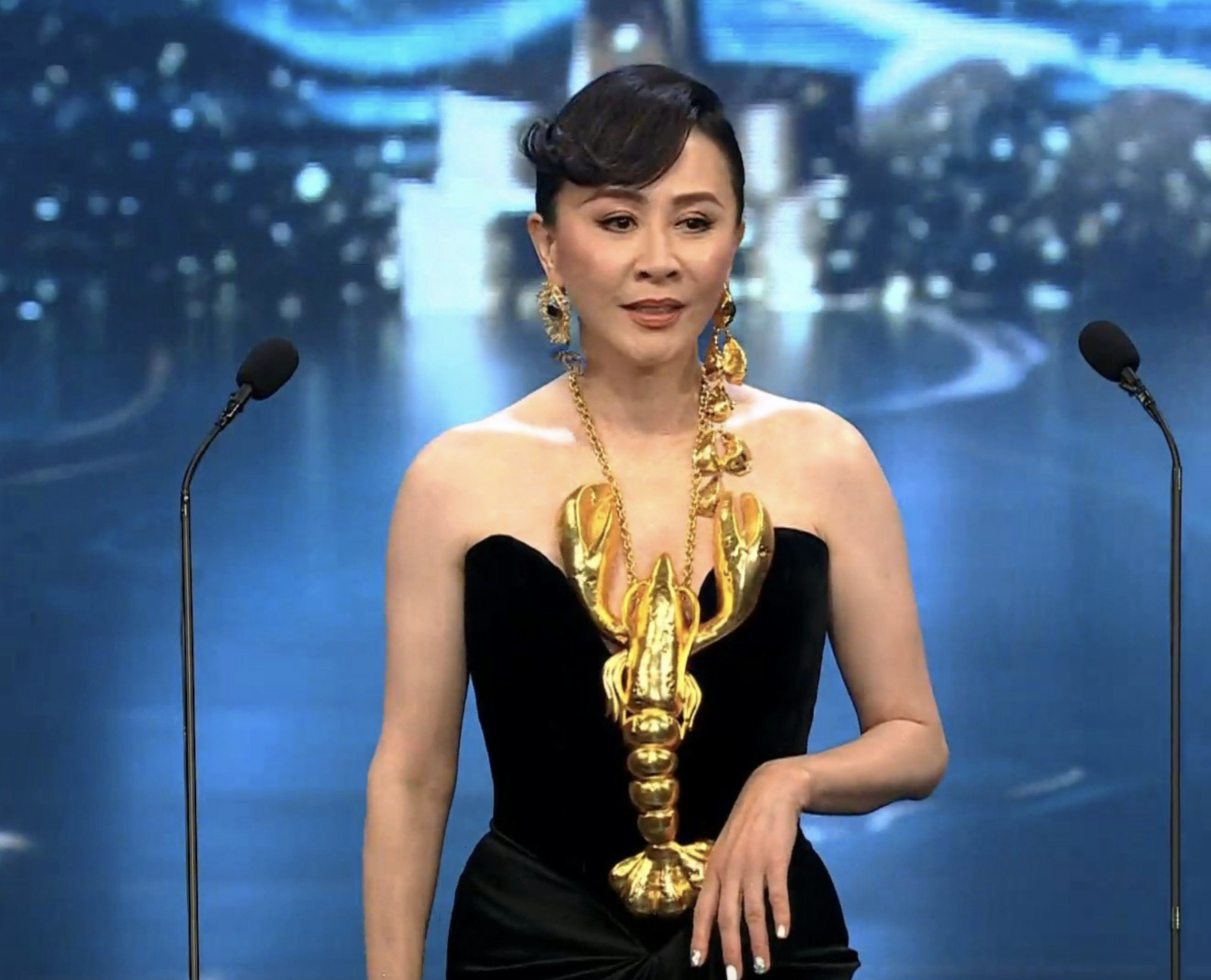 而嘉玲姐在這次金像獎頒獎典禮中所穿戴的金色「龍蝦配飾」,不但沒有引起時裝災難,更成功點綴她一身的衣著,氣勢十足,令她在芸芸電影人中突圍而出成為全場最受矚目的造型。