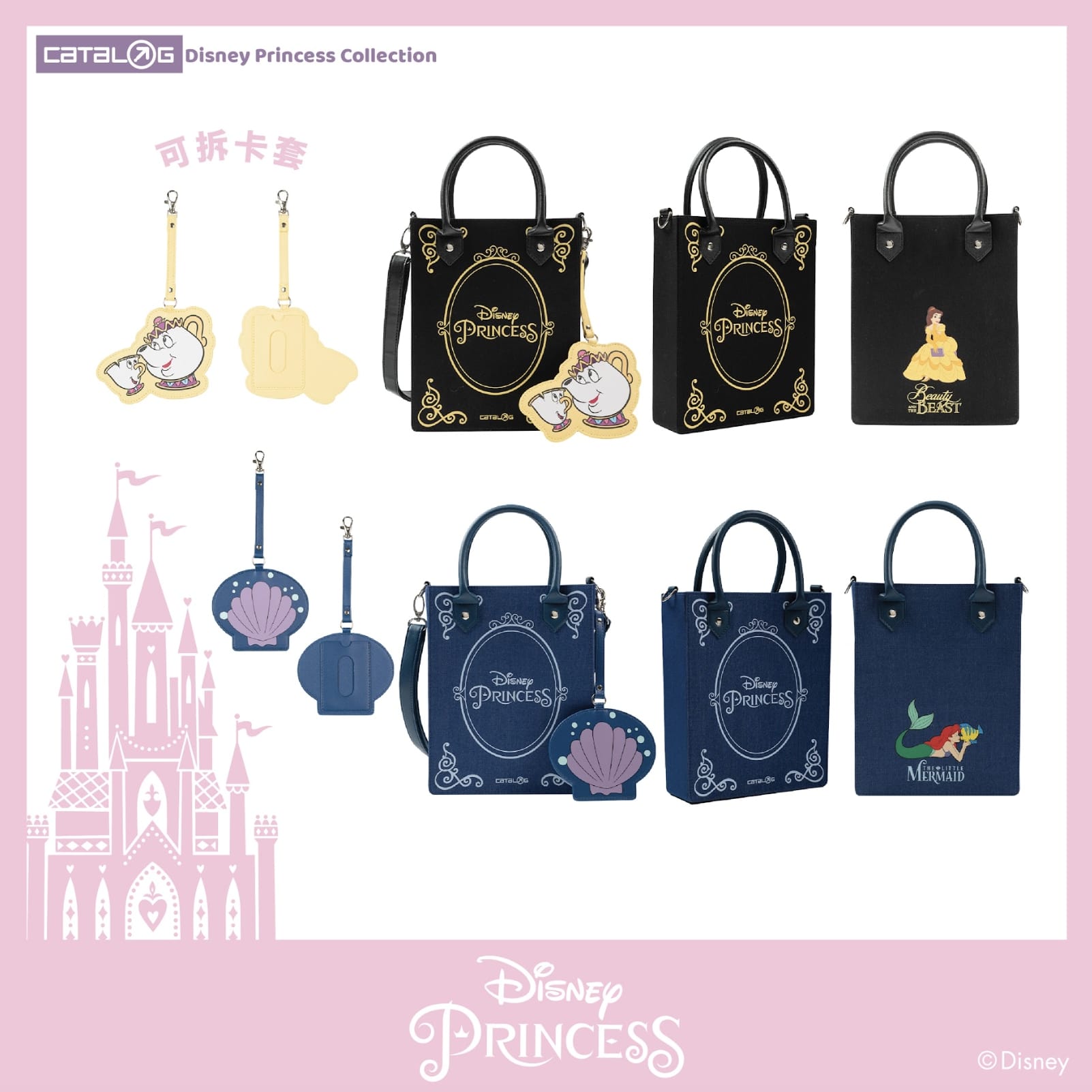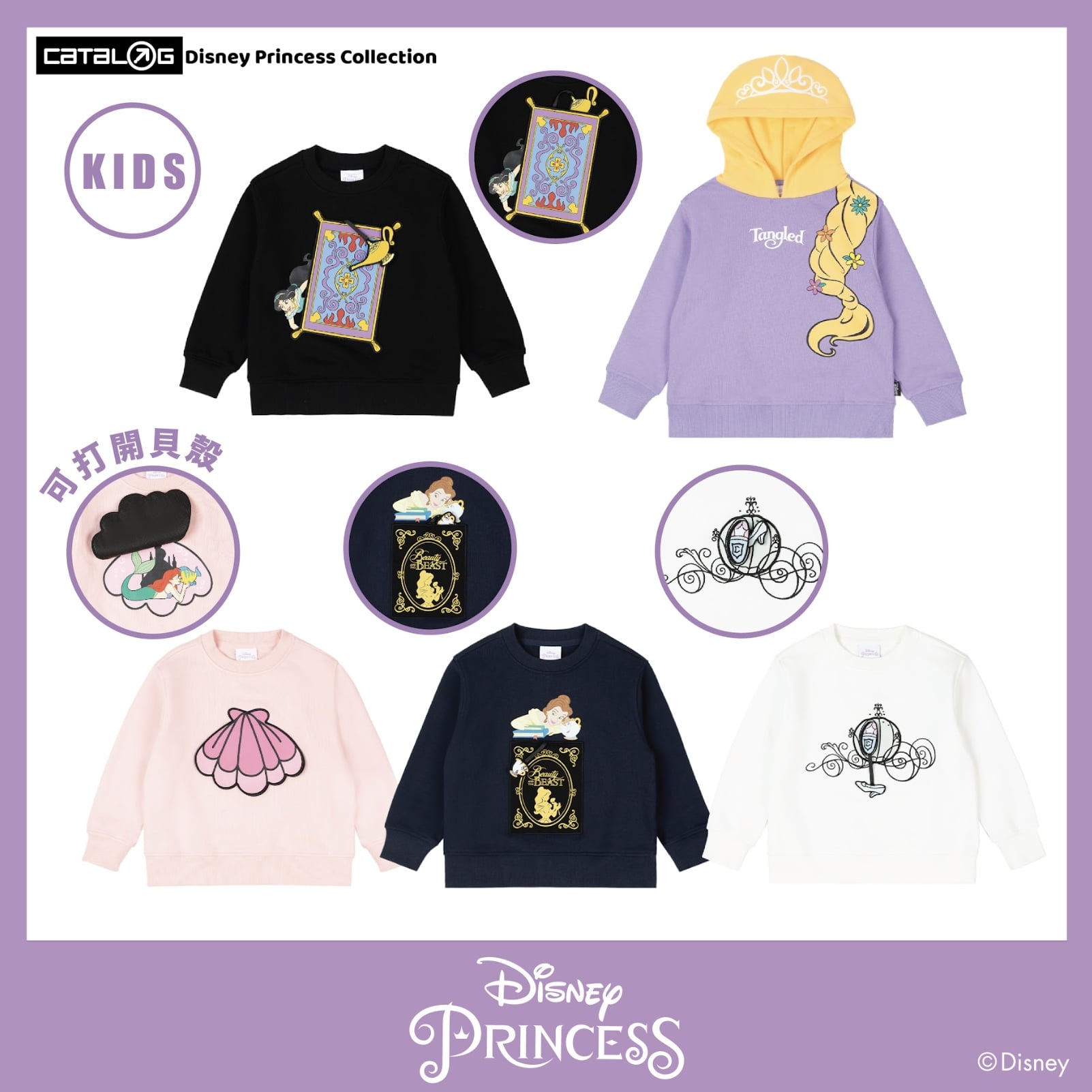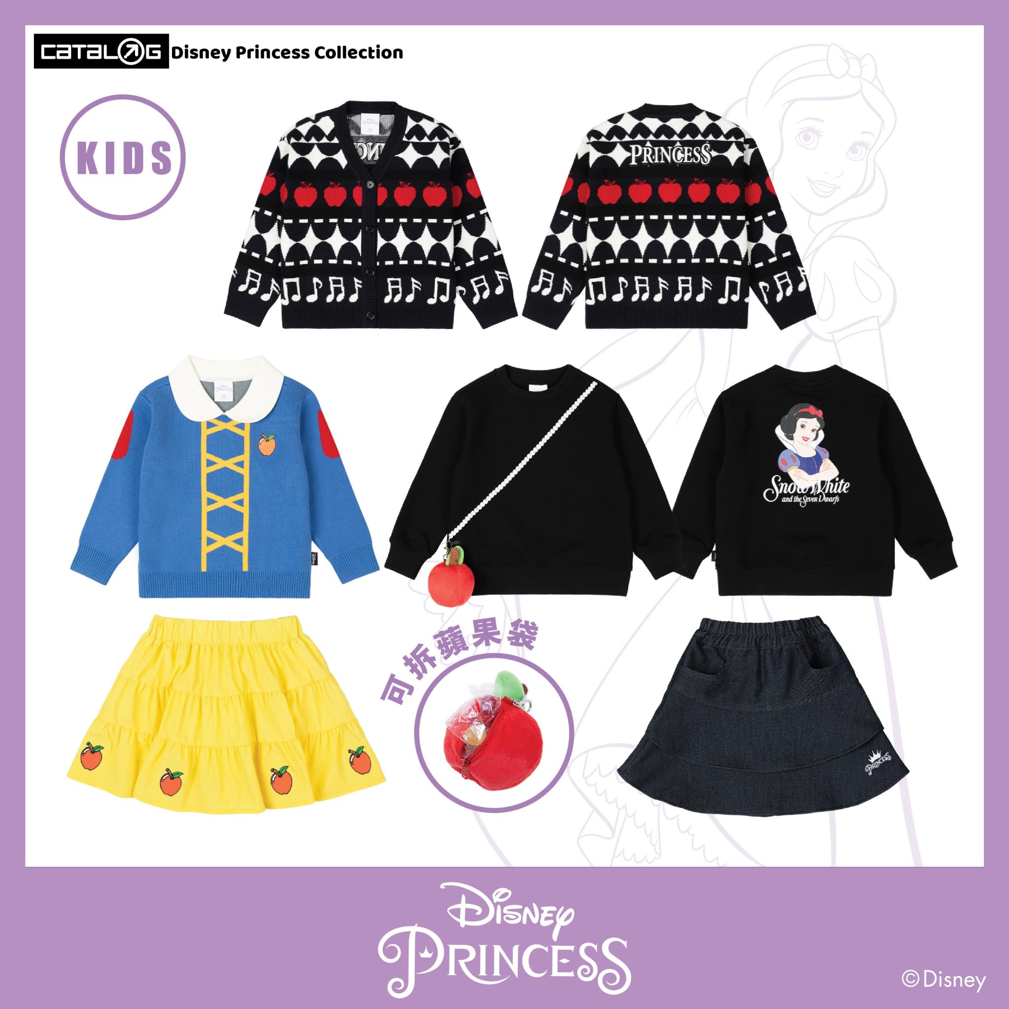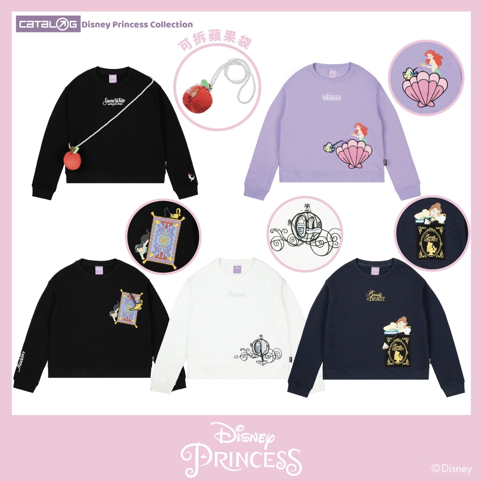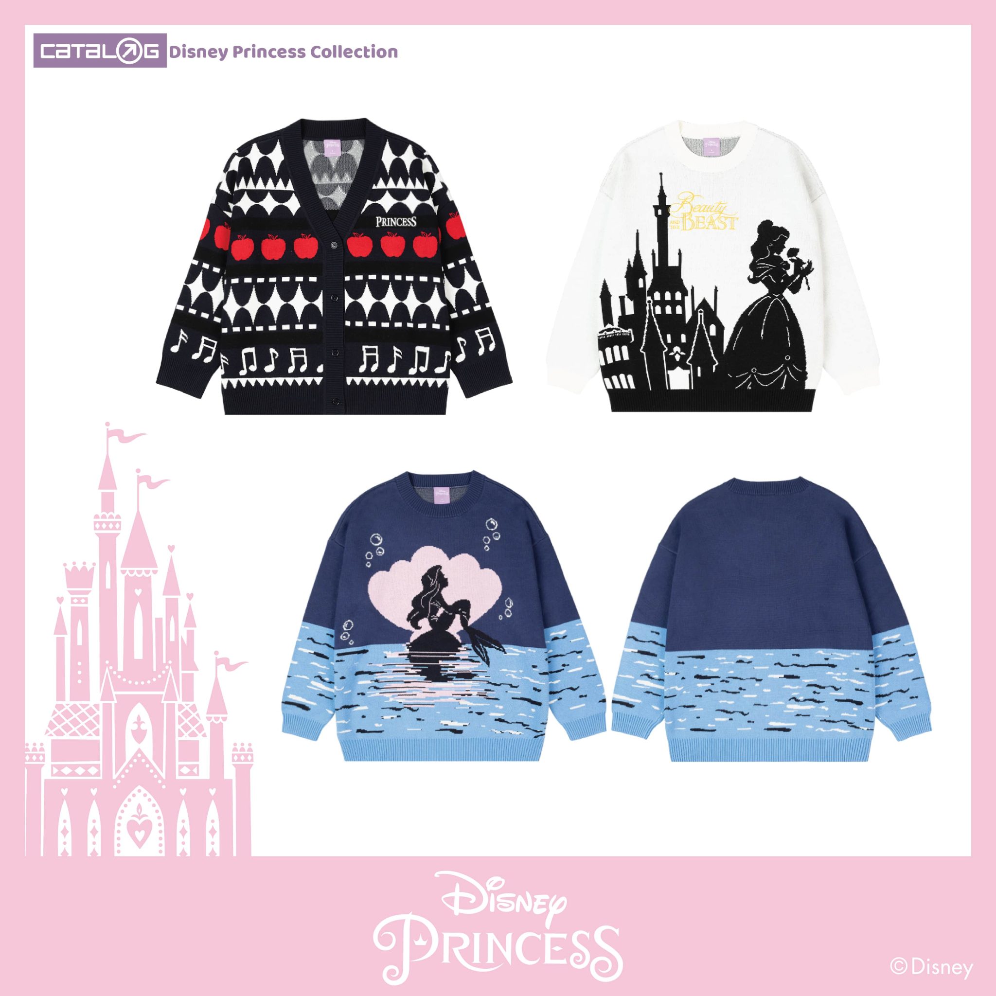 Catalog Disney Princess 系列以六位經典的公主作藍本, 包括貝兒公主、美人魚、灰姑娘、白雪公主、長髮公主以及茉莉公主,並且巧妙地將每一位公主最Iconic的元素,像是《白雪公主》中的蘋果和音符、《美女與野獸》中的城堡和貝兒公主的剪影等等恰到好處地注入於服飾與生活配件之中,具心思又不會過份浮誇,讓大家日常可以隨意穿著自己喜歡的公主服飾上街!