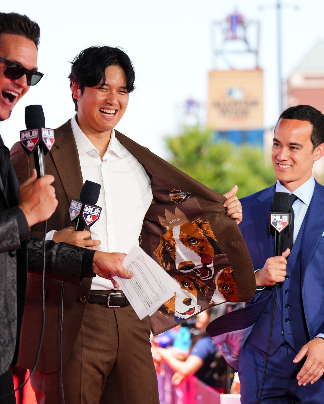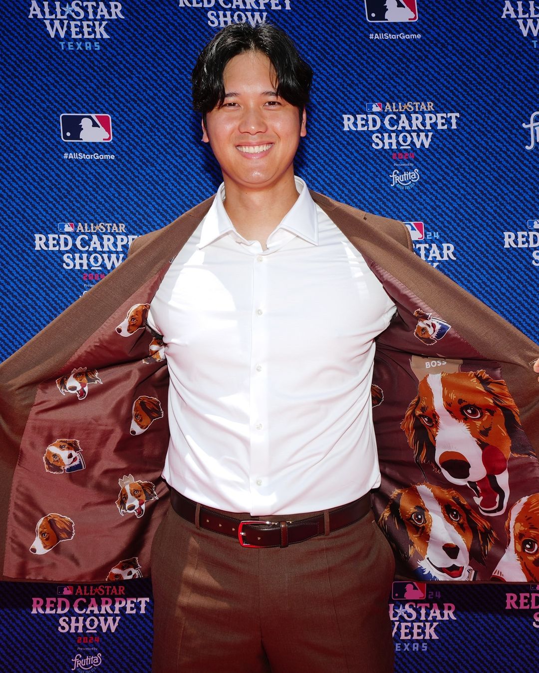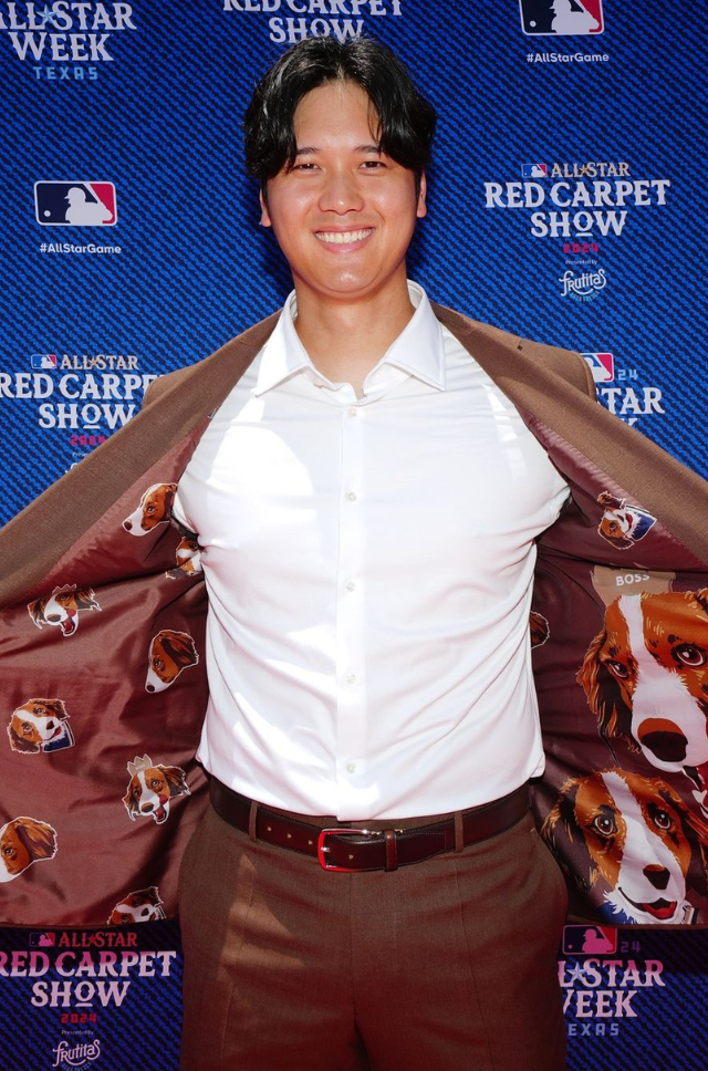 而讓人萬萬沒想到的是,大谷翔平這天身穿的西裝其實是充滿心思,他在介紹自己的造型時表示自己身上的 BOSS 西裝,顏色其實是根據自己的愛犬「Decopin」的來選擇的,話音未落,他就突然還解開西裝扣子、攤開西裝外套內襯給現場看 :「我的狗狗就在西裝裡面!」