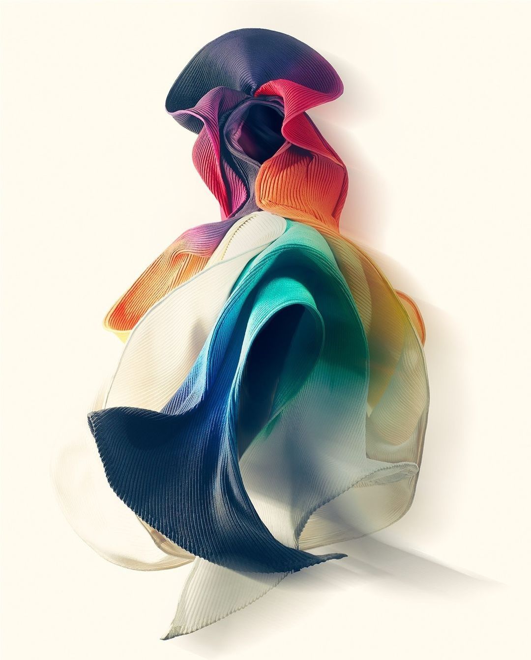 這件「彩虹皺摺洋裝」由設計師宮前義之帶領的「A-POC ABLE ISSEY MIYAKE」團隊設計並制作, A-POC ABLE ISSEY MIYAKE 團隊使用了 Brewed Protein™ 纖維與聚酯纖維的混合面料,采用三宅一生獨特的「Steam Stretch蒸氣延展」技術,利用不同材料熱反應的收縮率差異,讓布料創造出如水流般優雅的服裝廓型,制作出宇多田光身上這件絢麗多彩、擁有流動美感的特色演出服。