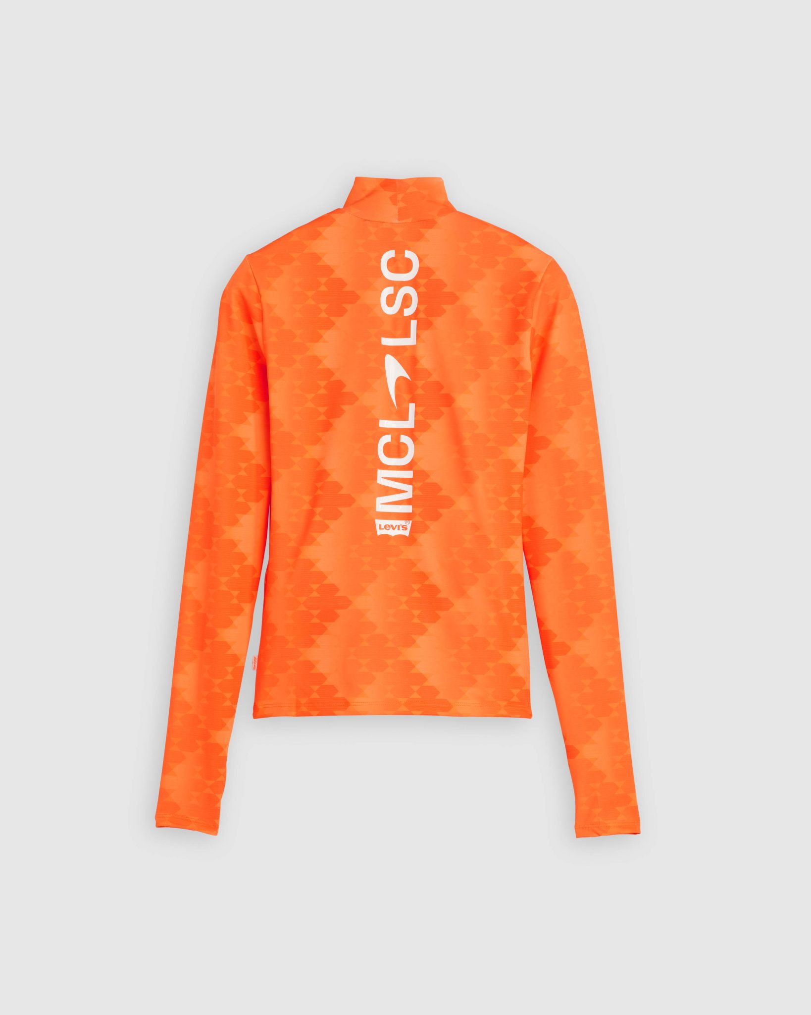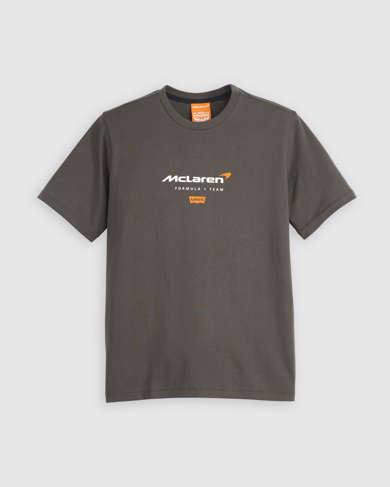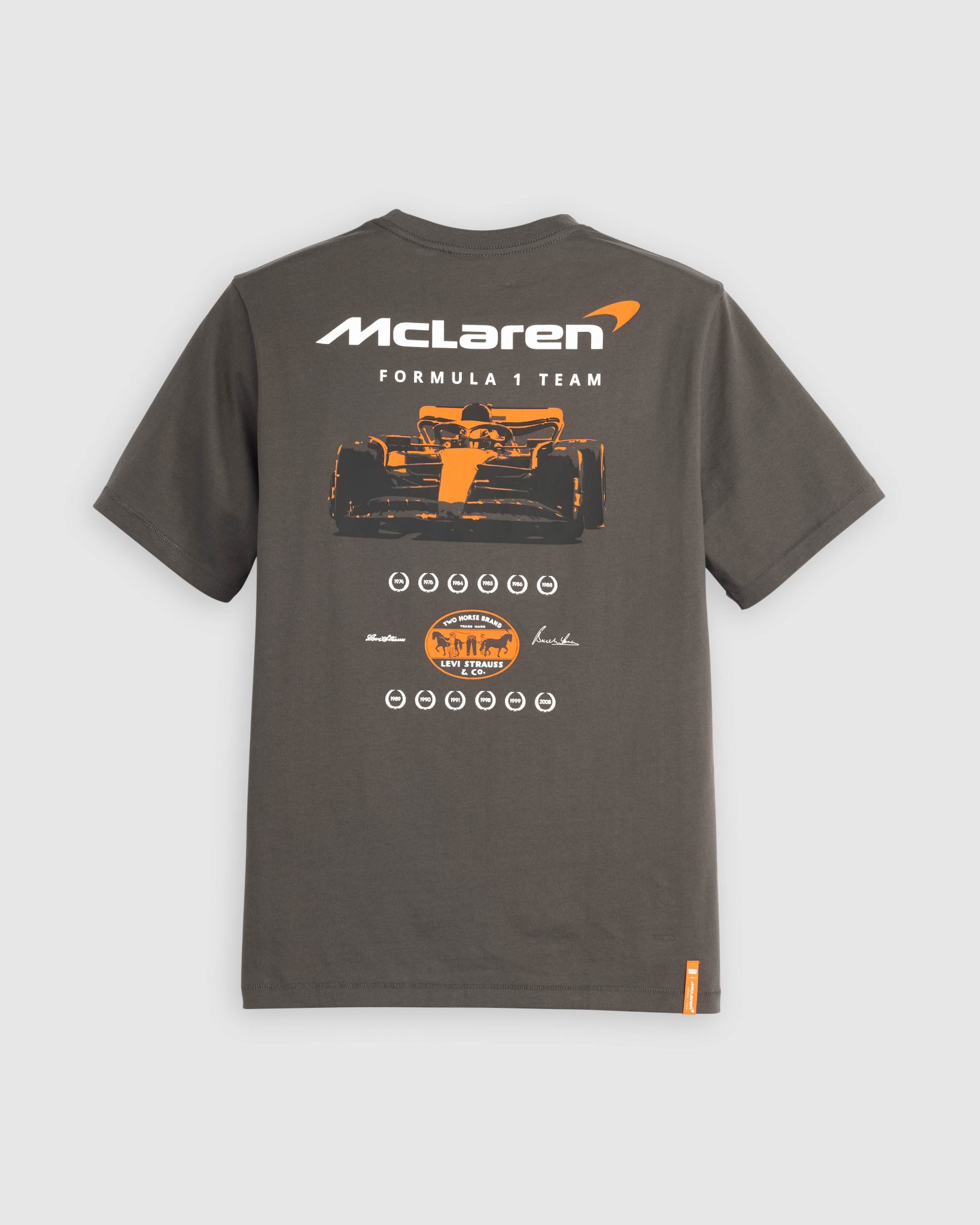 寬鬆版型的車隊T恤則以月桂花環印花紀念 McLaren 車隊多年來奪冠戰績,並印有Bruce McLaren和Levi Strauss的簽名,以及聯名標籤。淺灰色連帽衛衣的「McLaren FORMULAR 1 TEAM」字樣採用與緊身上衣相同的亮光矽膠印花技術呈現光亮效果及配有聯名「Horsepower」橙色標籤。長袖車隊圖案T恤同樣採用亮光矽膠印花技術印上在賽道上飛馳的現役 McLaren F1賽車,配有後領標籤和橙色「Horsepower」聯名標籤。