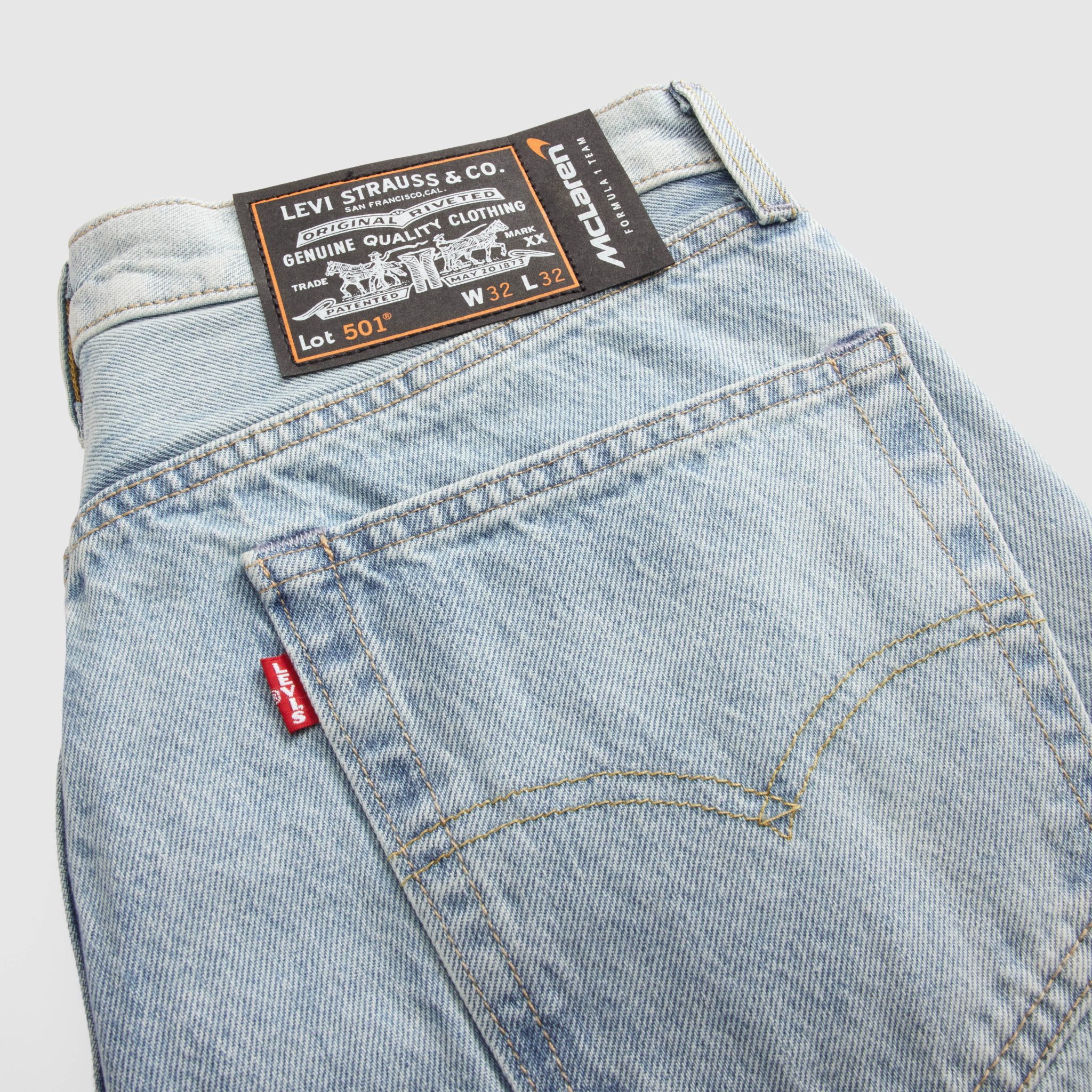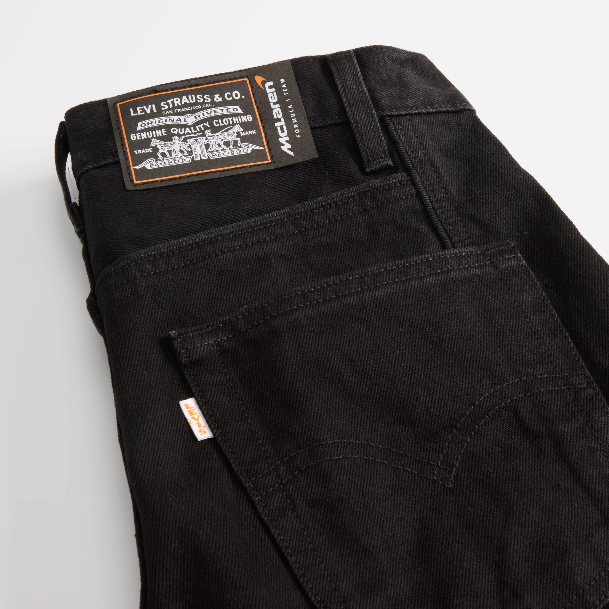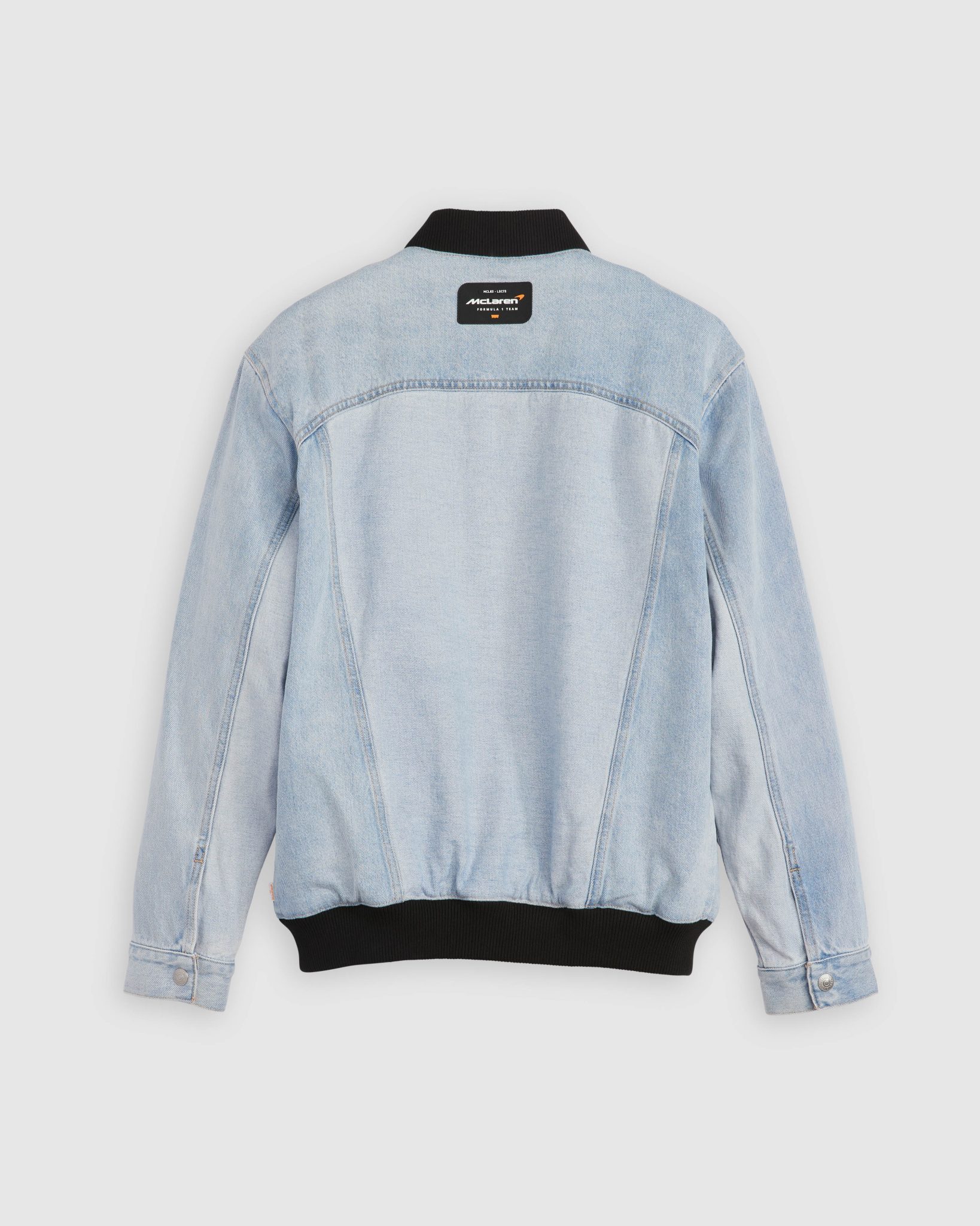 賽車牛仔褸以飛機褸版型設計,前幅及背部採對比色牛仔布拼接,並配上黑色羅紋領口和下擺,前胸有「McLaren FORMULAR 1 TEAM」刺繡字樣。而運動型 501® 牛仔褲,以經典款 ‘93 直腳版型為藍本,前褲腳位同樣有「McLaren FORMULAR 1 TEAM」刺繡字樣,與賽車牛仔褸相呼應。兩者均縫上仿賽車底盤牌的 McLaren F1車隊加上Levi’s® 蝠翼標誌的特製聯乘橡膠牌。