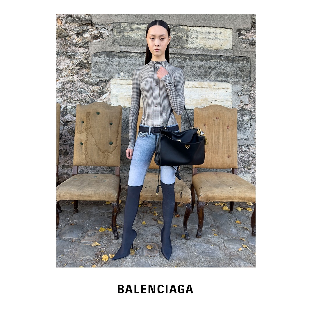 在 Balenciaga 2025秋冬系列的時裝大片中,韓國女槍手金藝智穿上品牌新系列的牛仔Bomber Jacket 搭配錯視覺的牛仔長靴,手提着一個新款的 City Bag 手袋,巧妙地以同色系的服飾來突顯出她手上的 City Bag 手袋。