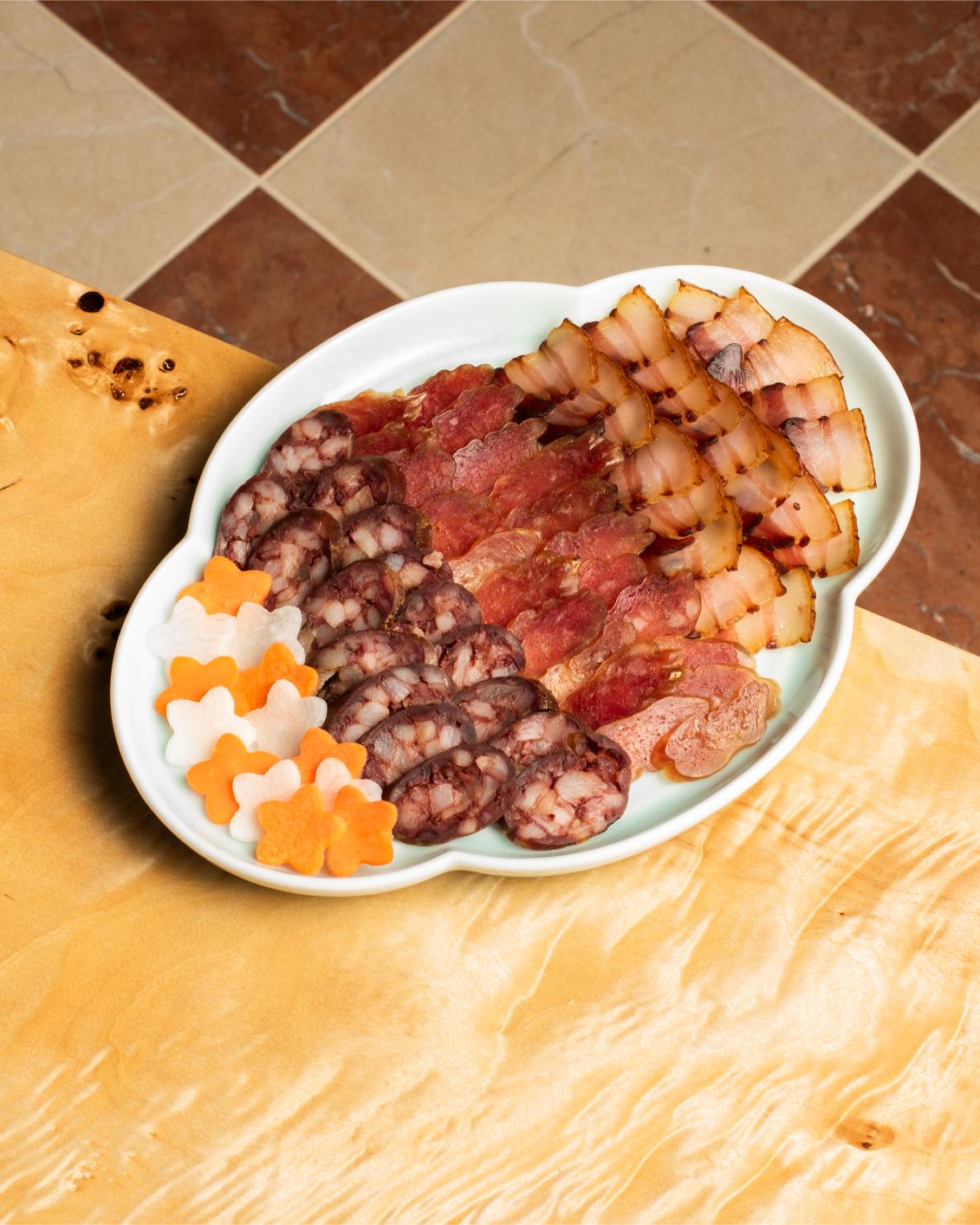與酒單一樣,餐單同樣以全新方式詮釋本地傳統美食,並由年輕有為的烹飪顧問Rachel Au和Sara Chang,設計出特色粵式菜館小食。鹹點方面,有臘腸拼盤配自家製醃菜,以本土方式重新演繹酒吧的經典冷肉拼盤小食。加上酒吧所選用的臘腸,選購至酒吧附近的老字號三興隆臘味,注入濃厚的懷舊元素。其他小食,包括蝦多士、鹽焗雞塊配雞油蛋黃醬和蔥油、咖喱魷魚配炸饅頭等,充滿懷舊風情。和牛牛舌焗飯,就用上24個月的陳年康堤芝士,暖意窩心。
