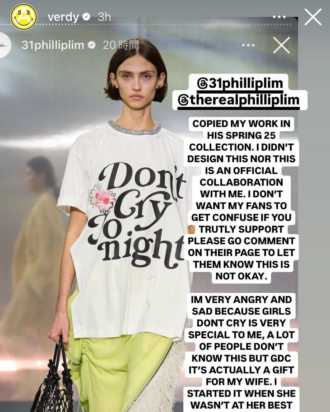 3.1 Phillip Lim 在 2025 年春夏系列中推出了一系列印有像是「Don’t Cry Tonight」、「Always Forever Baby」標語的 T-shirt ,這些T-shirt 看起來的確與日本藝術家 Verdy 手下的個人品牌「Girls don’t cry」設計非常相似,因此當 Verdy 在 Instagram 上發出該 Story 控訴 3.1 Phillip Lim 後,不但引起更多人關注此事件,同時有大部份人也在此事選擇支持 Verdy 。
