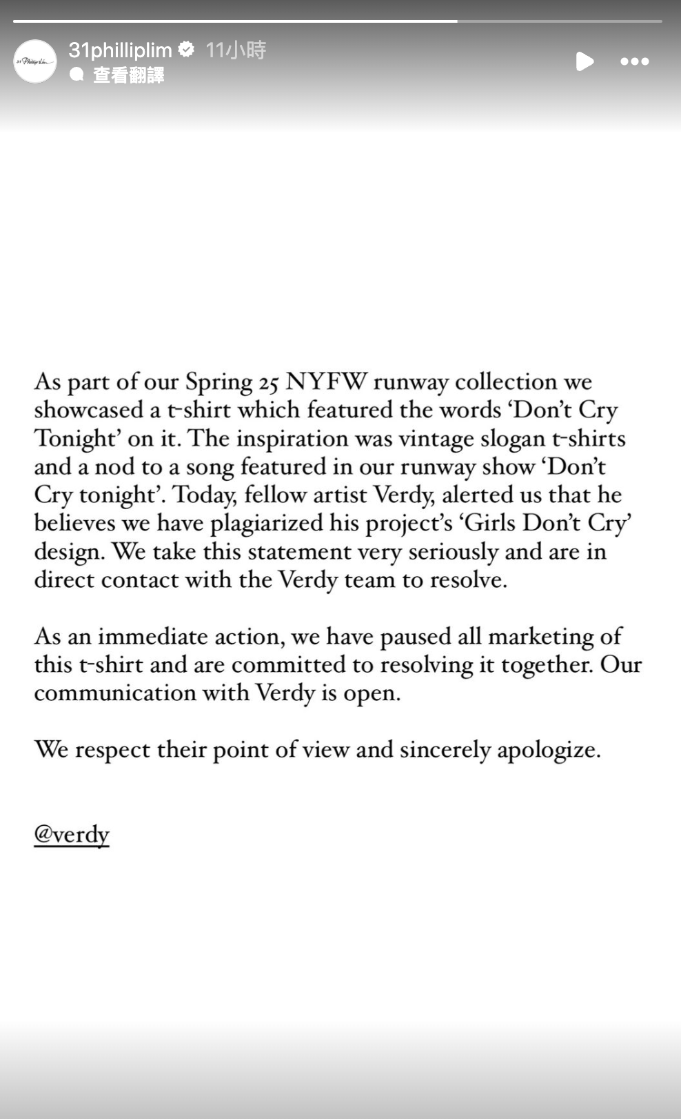 而及後,眼見事件愈鬧愈大,3.1 Phillip Lim 方面亦馬上出來澄清,品牌在 Instagram 上發表了聲明向 Verdy 的團隊道歉,聲明中指出該設計是為了向 3.1 Phillip Lim SS25 時裝秀中的歌曲《Don’t Cry Tonight》「致敬」,而他們也暫停了這款 T -shirt 的發售,並正與 Verdy 團隊聯繫,希望盡快能解決問題。