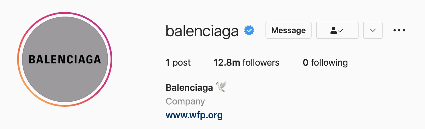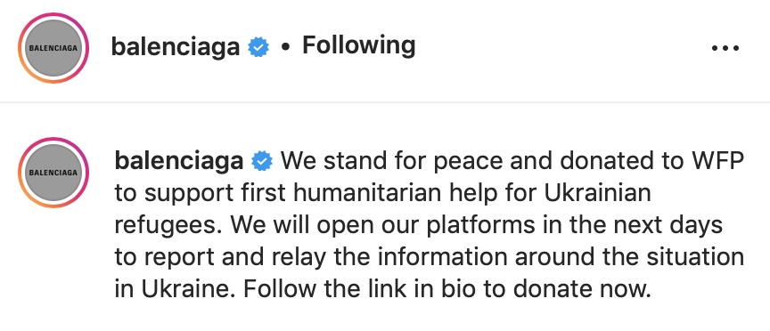 Balenciaga的IG從去年7月把文章清空後,就一直是空白的狀態,近日先是上傳全白色的照片並配上一隻代表和平鴿的Emoji,接著幾天後改成一則代表著烏克蘭國旗的黃藍照片,並配以「我們與和平同行,我們會捐助 WFP,對烏克蘭難民實施人道救援。同時,我們會在之後的幾日開放平台,去報導烏克蘭最新的情況」,品牌也在帳戶簡介中加入了代表著和平的白鴿 Emoji,亦附上WFP捐款網址,呼籲大家一同捐助 WFP,以幫助飽受戰火摧殘的烏克蘭。
