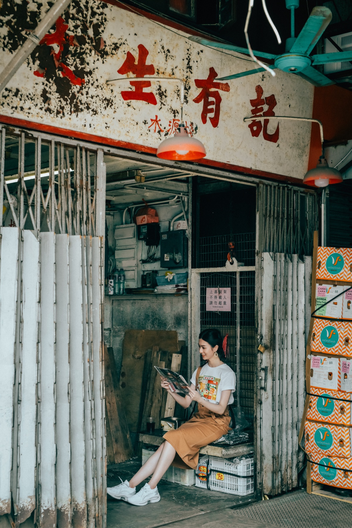 插畫師謝曬皮以貼地畫風紀錄下心目中的果欄。高低堆疊的水果箱、上落貨不斷的木頭車,從夜晚至凌晨的搬運,到早上顧客絡繹不絕,不分晝夜的果欄也正正展現了香港人數代人的拼搏精神。