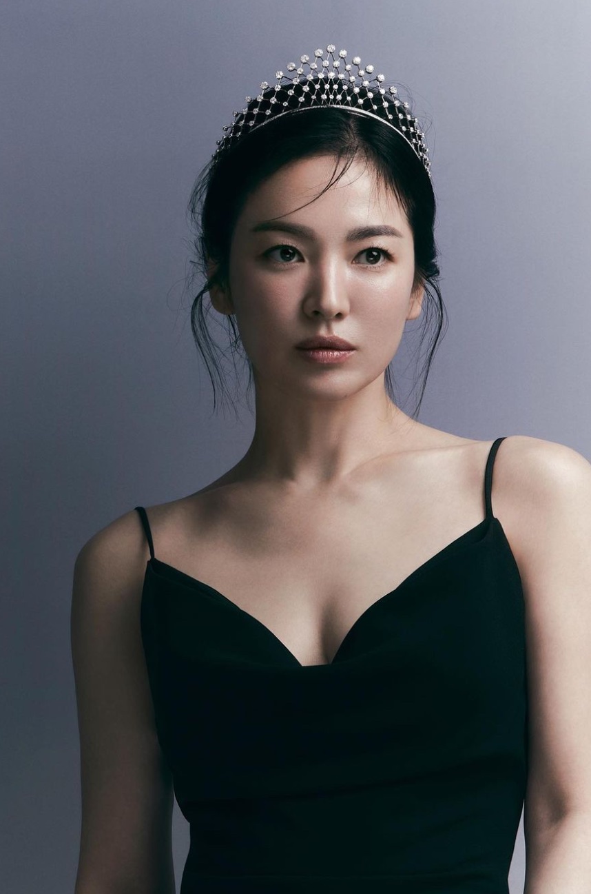 在另一個造型中,宋慧也穿上黑色細肩帶禮服,將中長髮盤起,頭上配戴鑲嵌明亮式切割鑽石的 Dentellede Lumière 冠冕,就像童話走出來的高貴公主。