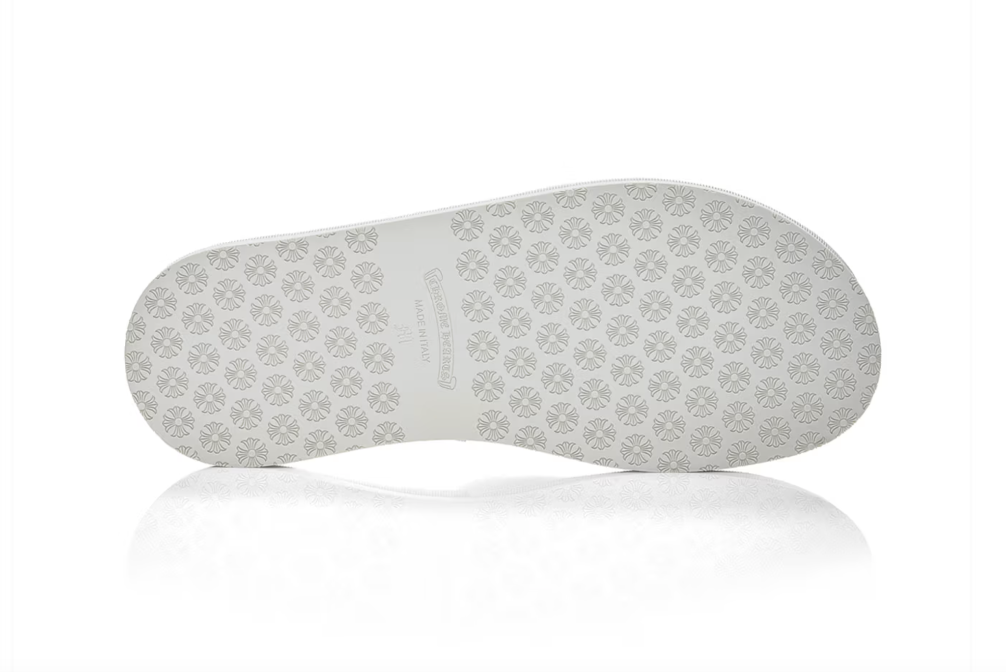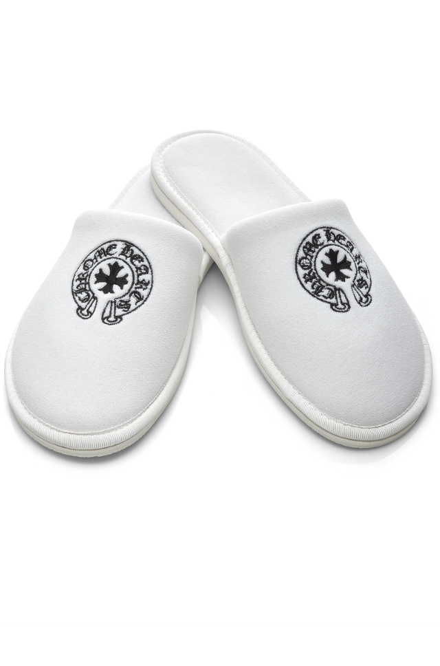這次 Chrome Hearts 就推出了一雙價值$4500 港幣的酒店拖鞋( HOTEL SLIPPERS ),根據品牌在官網上的描述,這雙全白的酒店拖鞋於意大利製造、以 100% 的純棉製成、採用較耐用的橡膠大底,鞋面上繡上了大大的品牌 Logo,虛榮感十足。