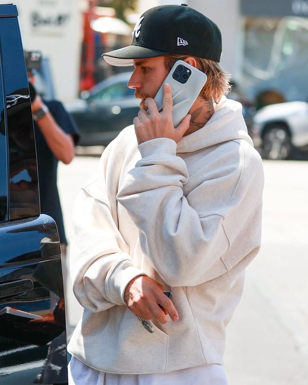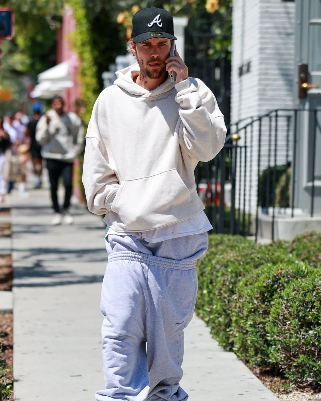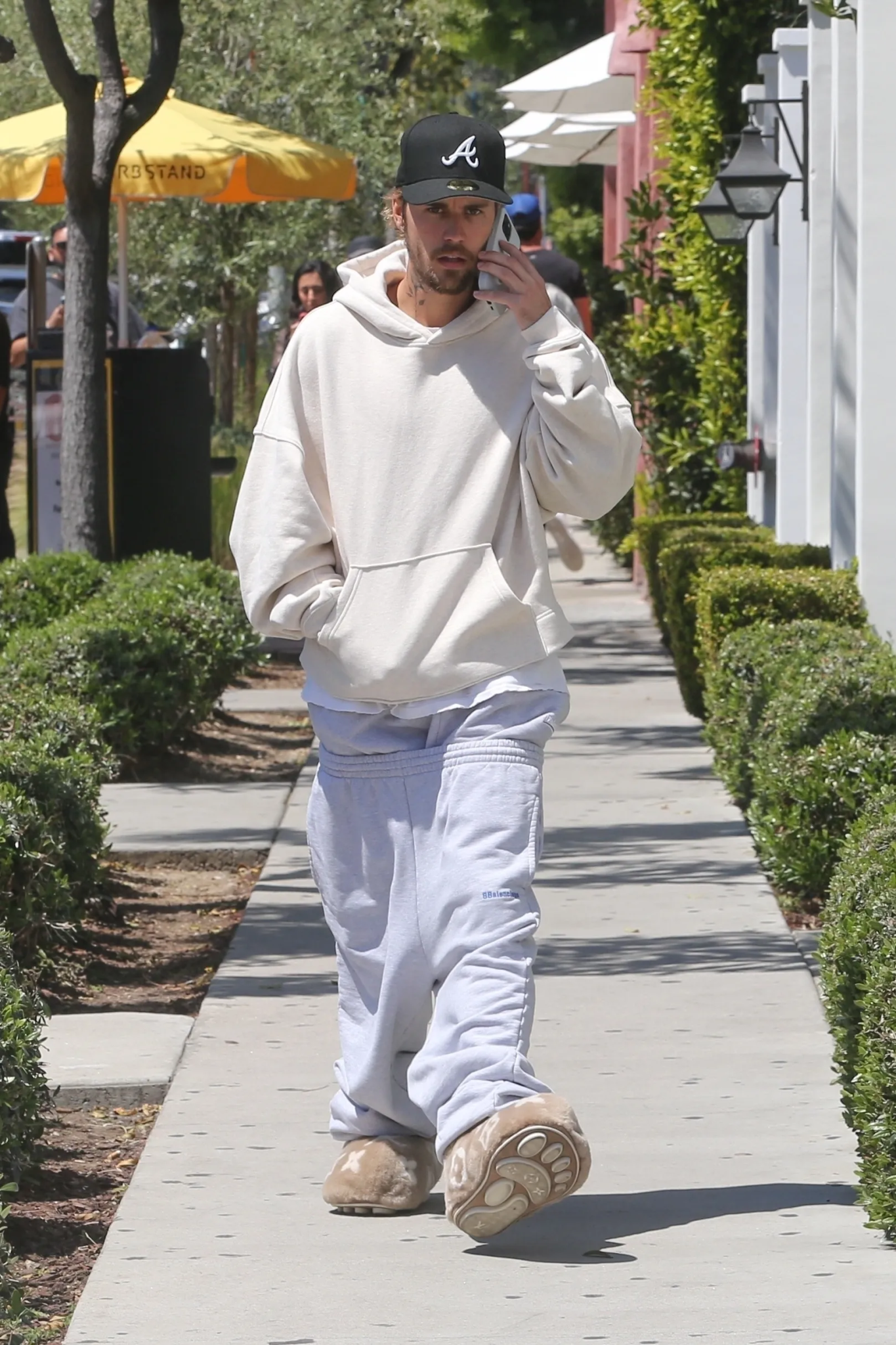 早前,Justin Bieber 頭戴棒球帽,並穿上了一套全灰色的衛衣套裝示人,你細心留意的話就會發現他下身其實有玩「Layering」-他穿上了兩條棉褲,而且其中一條還只穿著一半,腳下還踏著一雙毛茸茸、鞋底有熊掌印花的低筒靴,為造型增添了幾分玩味。