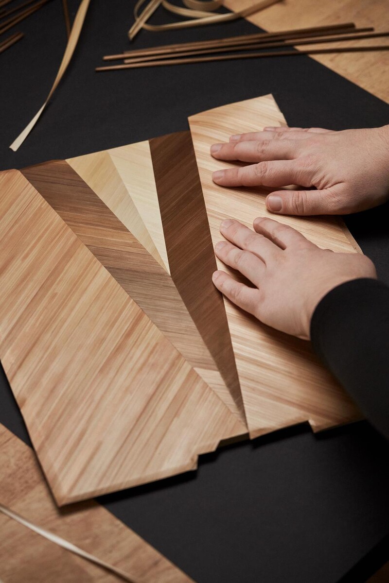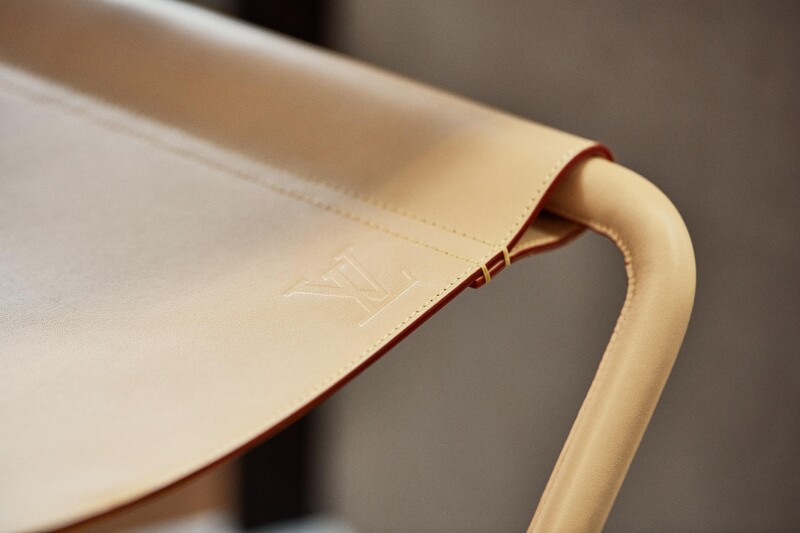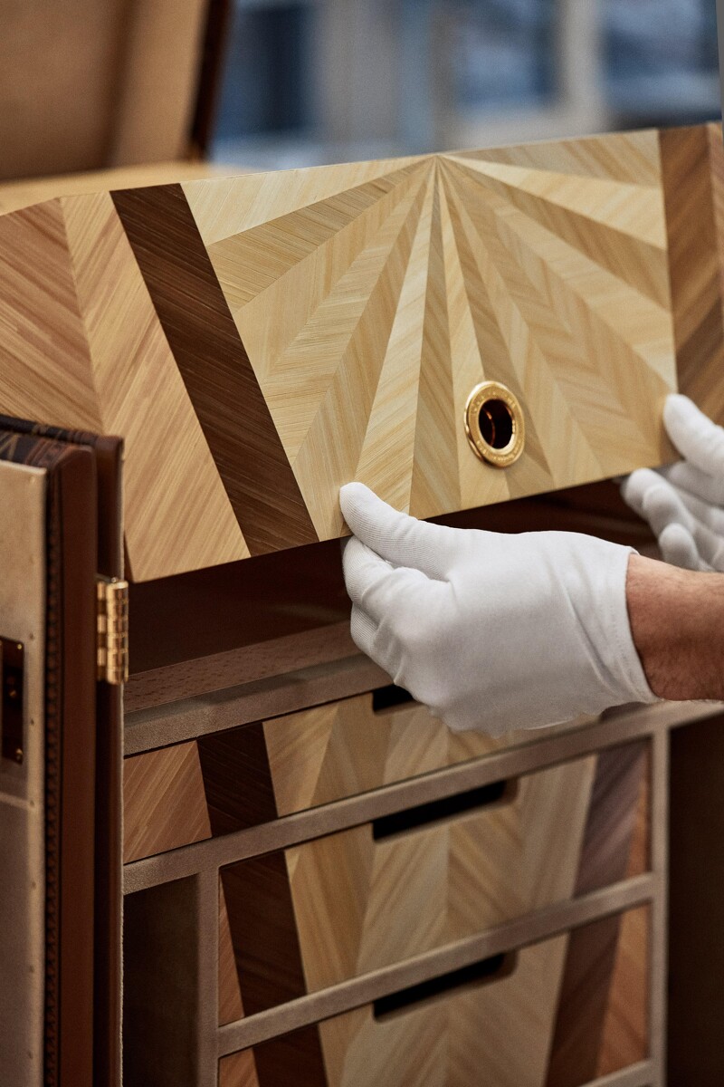 如果將桌子收納起來,可以看到箱面及內層精巧的設計以及LV Logo,它運用的是曾獲ELLE x LVMH 女性手工藝獎的「麥稈鑲嵌技術」,這種技術搭配法國勃艮第種植的黑麥秸稈,並以三種顏色在箱身上營造出光影變化,讓平面的裝飾瞬間帶有高級立體感!