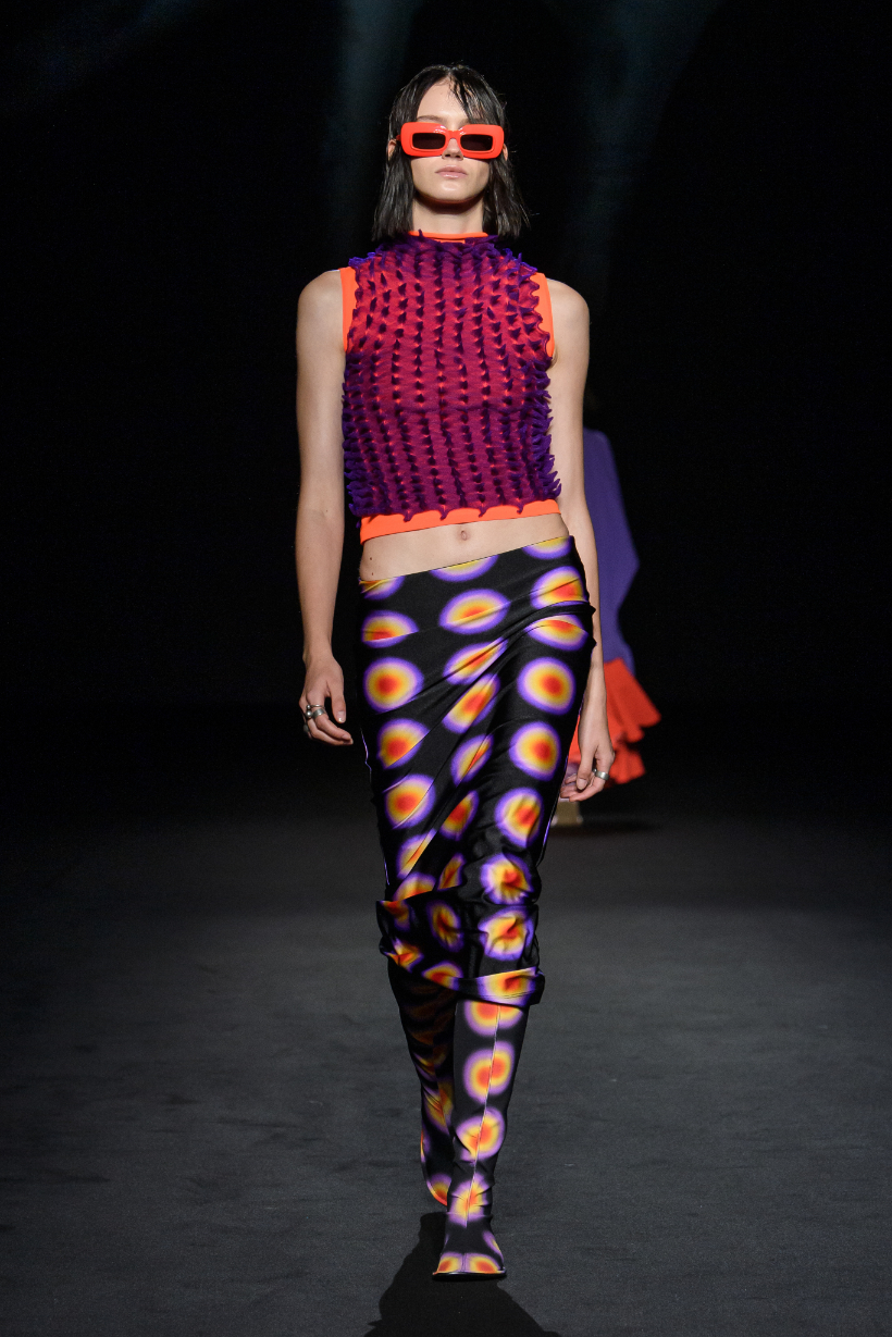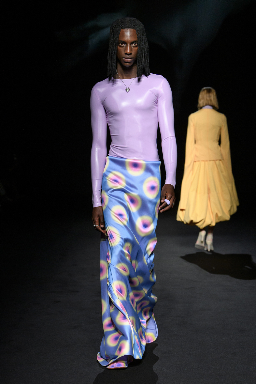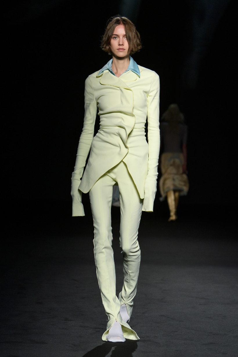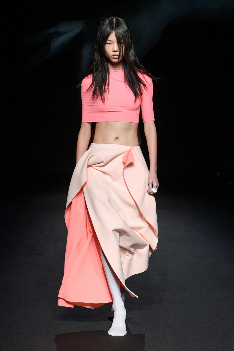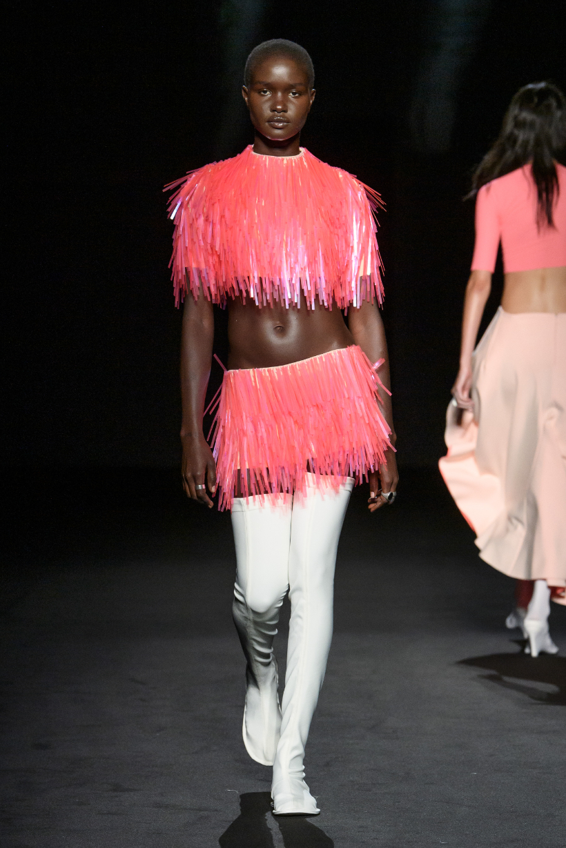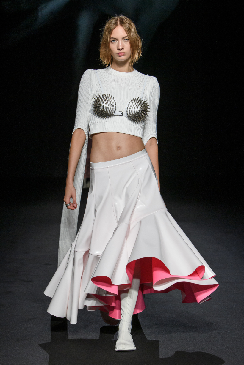 新季系列從不同時代經典風格中汲取靈感,經解構與重組,打造出鮮明對比的各式造型。1950 年代的A 字、窄肩、低腰與大喇叭廓形,60 年代的未來主義太空風格,以及90年代由Techno電子科技舞曲和地下狂野派對中的cyberpunk元素構成的反主流文化造型一同呈現。整個系列由此化身一場永不停息的實驗,在Sugarpunk 、Psycho-chic 和Techno-couture風格之間碰撞,拒絕墨守成規,同時不懈追求極限。
