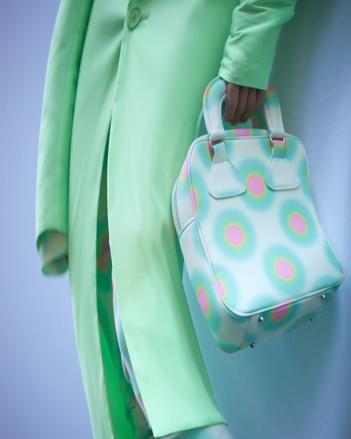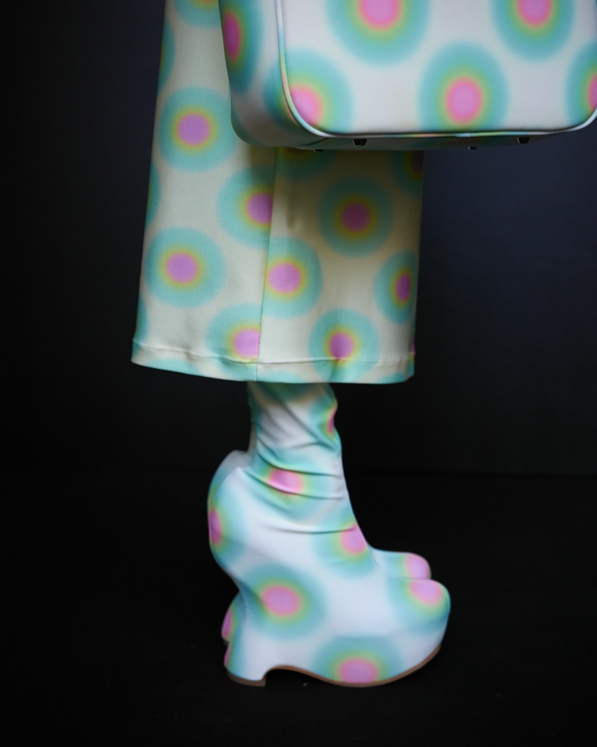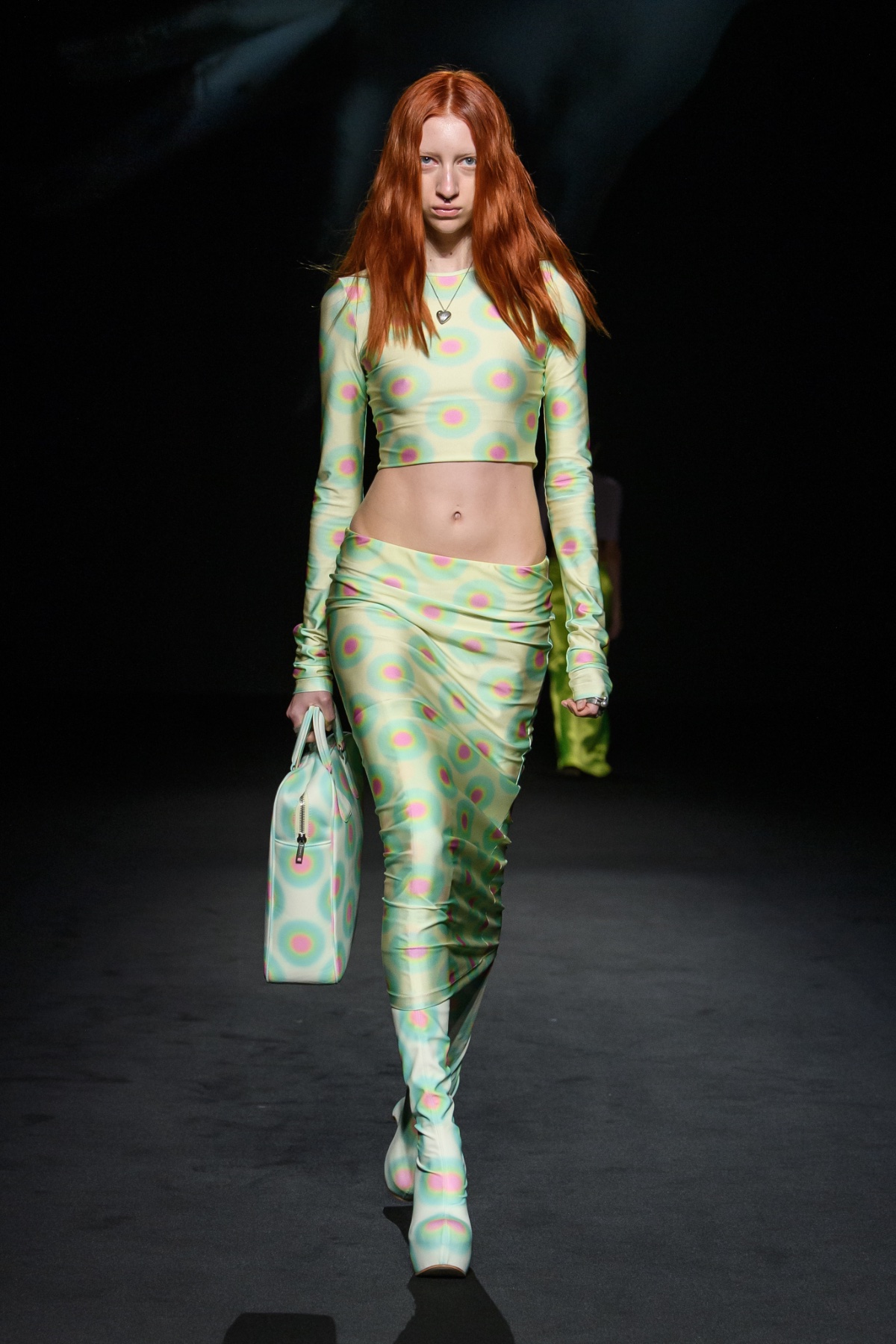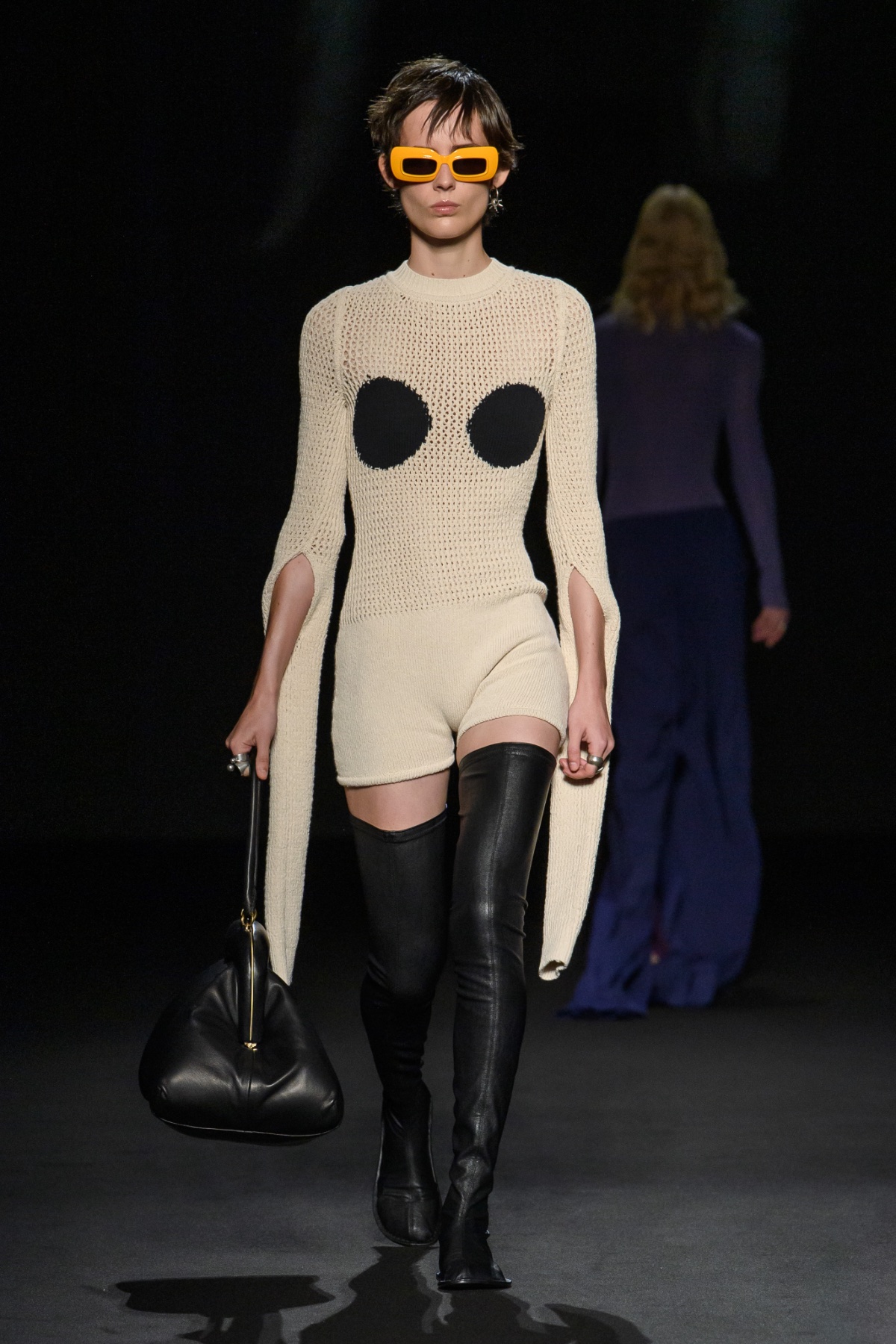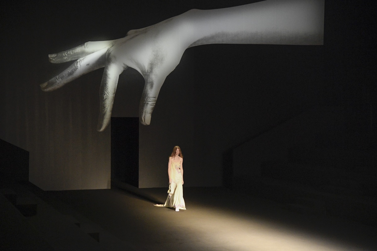 新季系列從不同時代經典風格中汲取靈感,經解構與重組,打造出鮮明對比的各式造型。1950 年代的A 字、窄肩、低腰與大喇叭廓形,60 年代的未來主義太空風格,以及90年代由Techno電子科技舞曲和地下狂野派對中的cyberpunk元素構成的反主流文化造型一同呈現。整個系列由此化身一場永不停息的實驗,在Sugarpunk 、Psycho-chic 和Techno-couture風格之間碰撞,拒絕墨守成規,同時不懈追求極限。