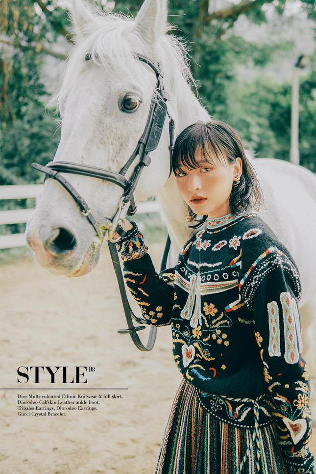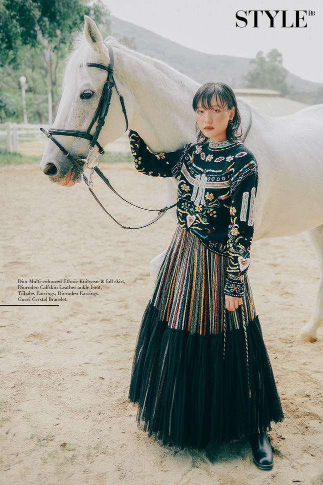Dior 民族針織衫, 彩色民族連身紗裙, 小牛皮踝靴, 小圓珠駿馬耳環, 小圓珠獅子耳環.