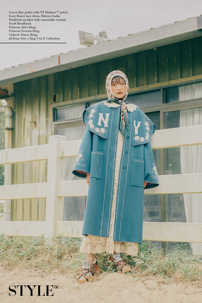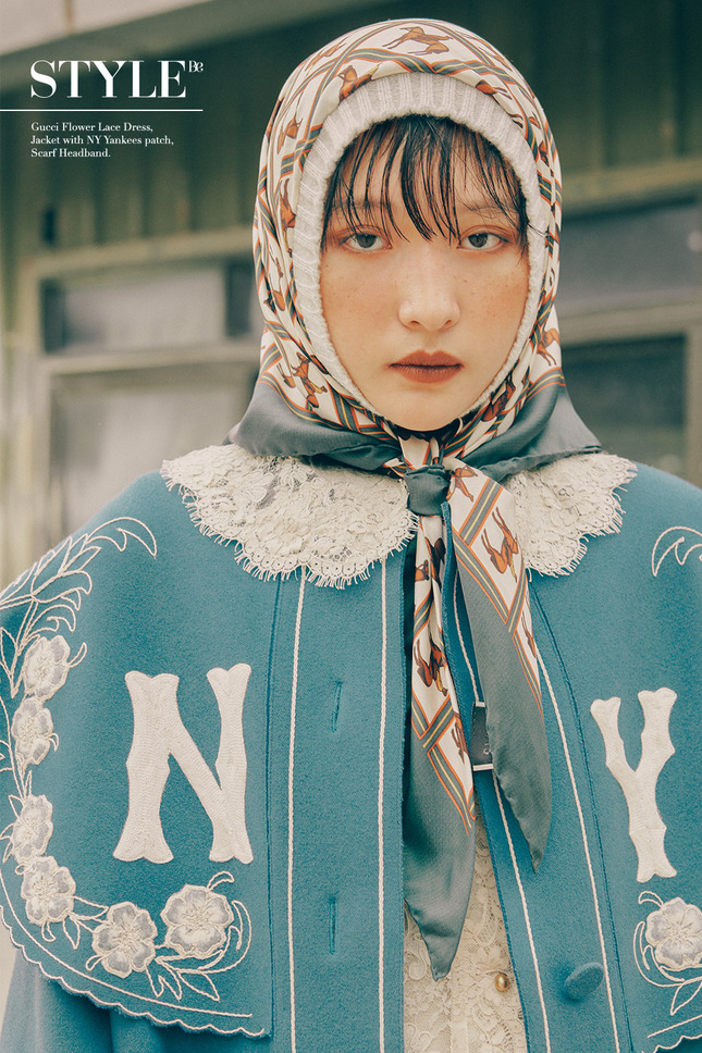Gucci 藍天 NY Yankees 外套, 杏色花紋蕾絲連衣裙, 馬匹印花頭巾.