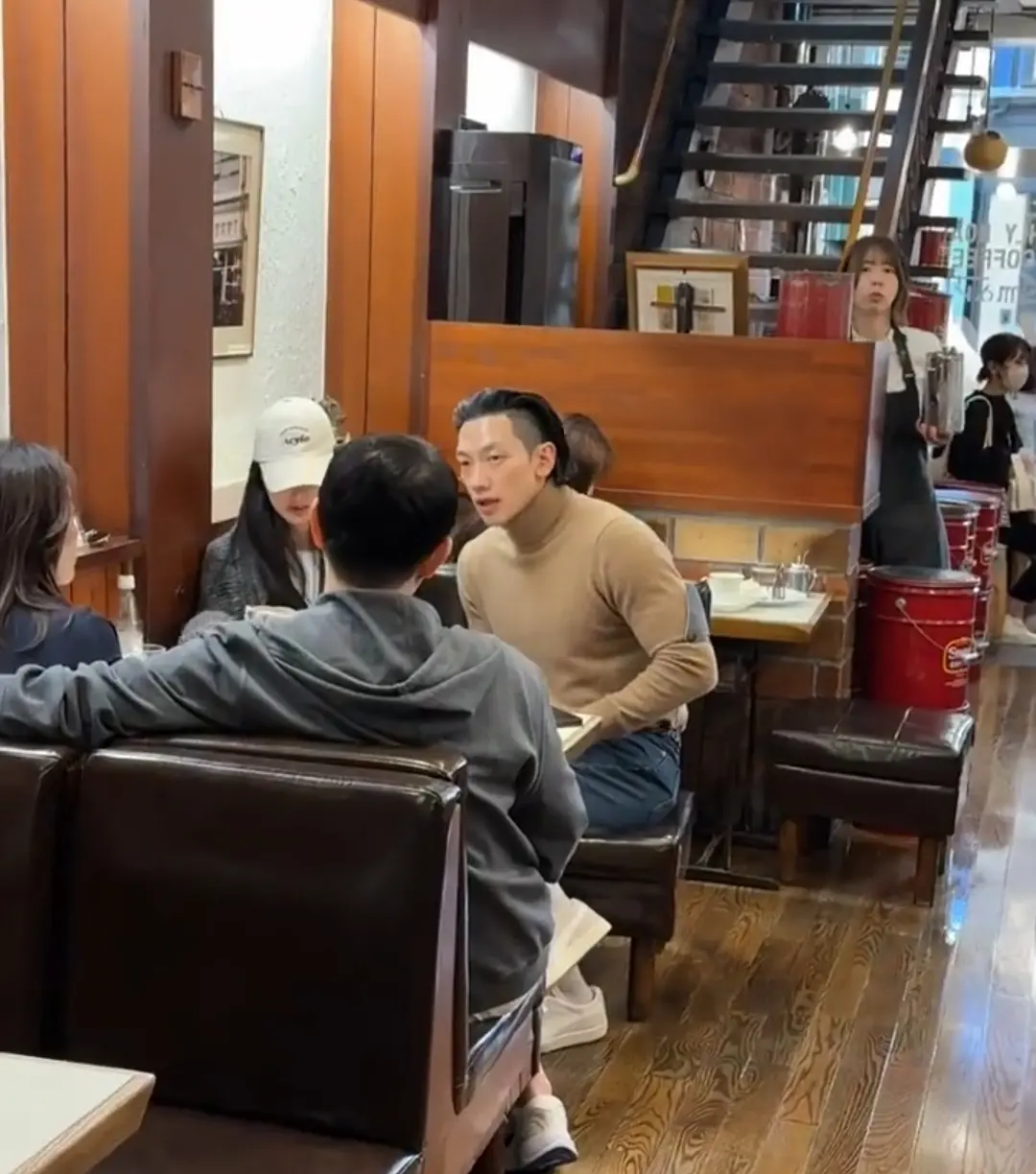網民表示最近在日本京都旅行時,就偶遇一對超亮眼的男女在餐廳吃飯,男方穿上咖啡色高領緊身衫,盡顯澎湃的胸肌。而旁邊的女生則頭戴鴨舌帽,但顏值就相當高,後來才發現原來他們就是Rain與金泰希。